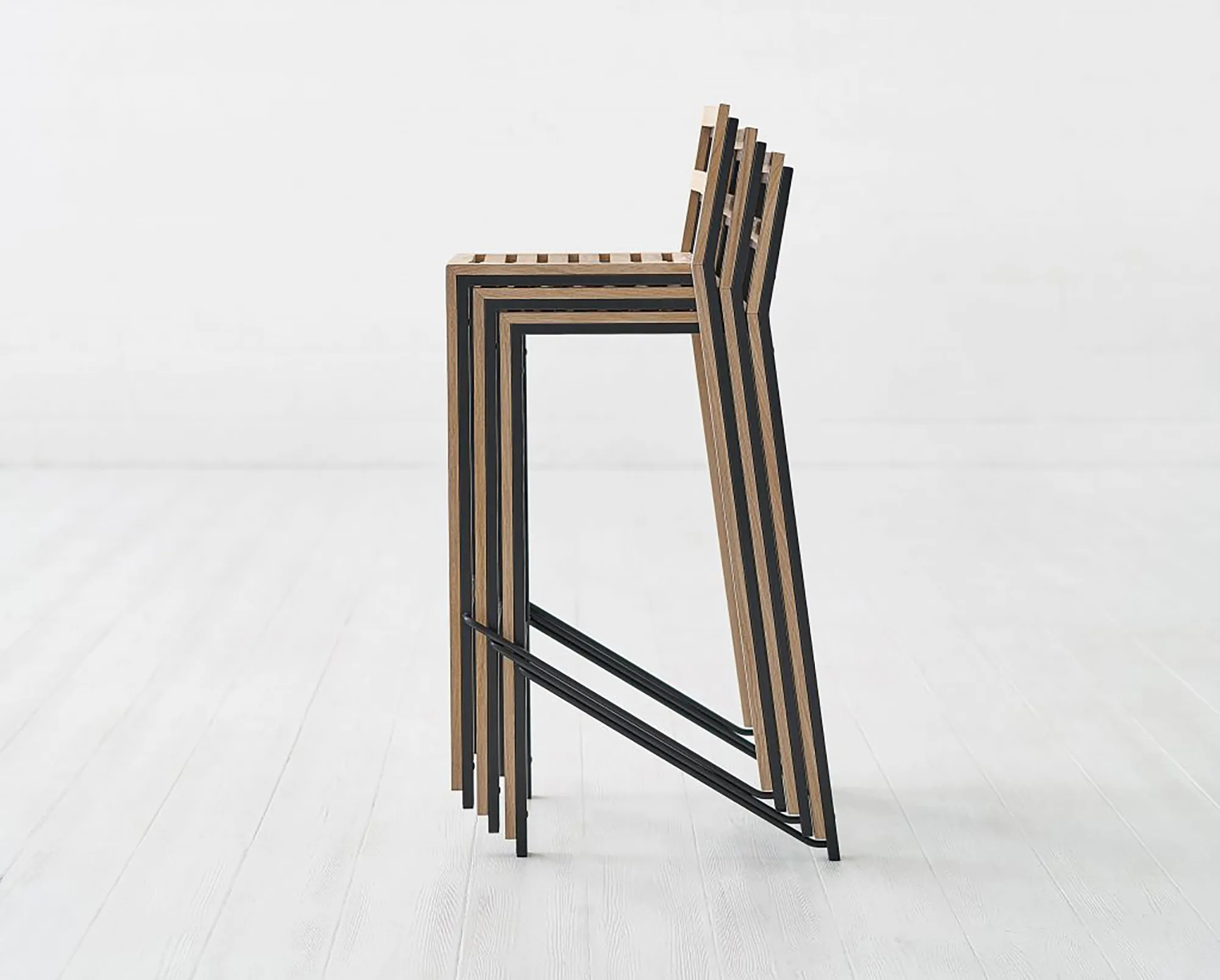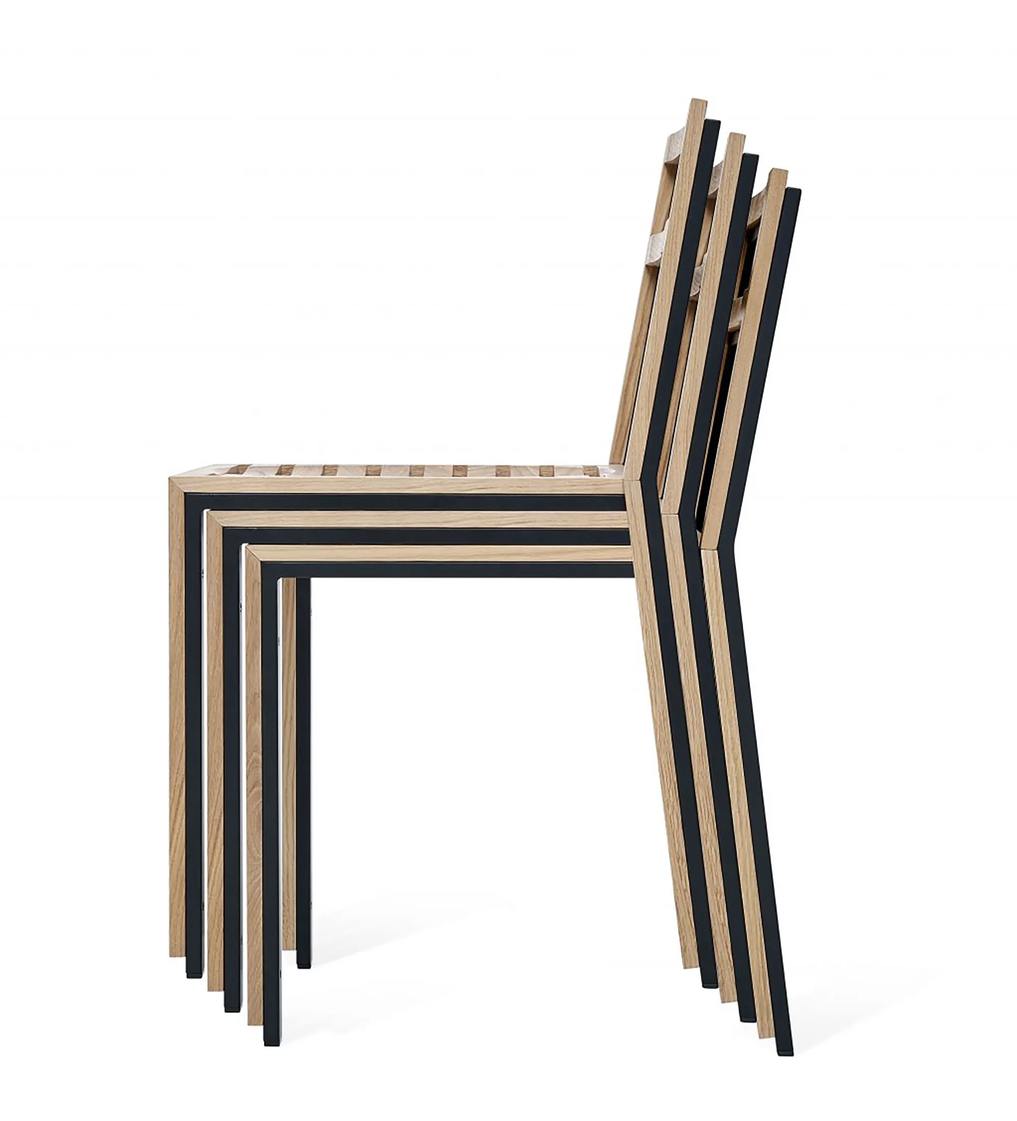 The metal frame serves as an exoskeleton of the wooden chair, providing it strength and allowing it to be so slim. The result is a robust stackable side chair and bar stool where you get tactile advantages of seating on the wood, combined with the strength of the steel tube.