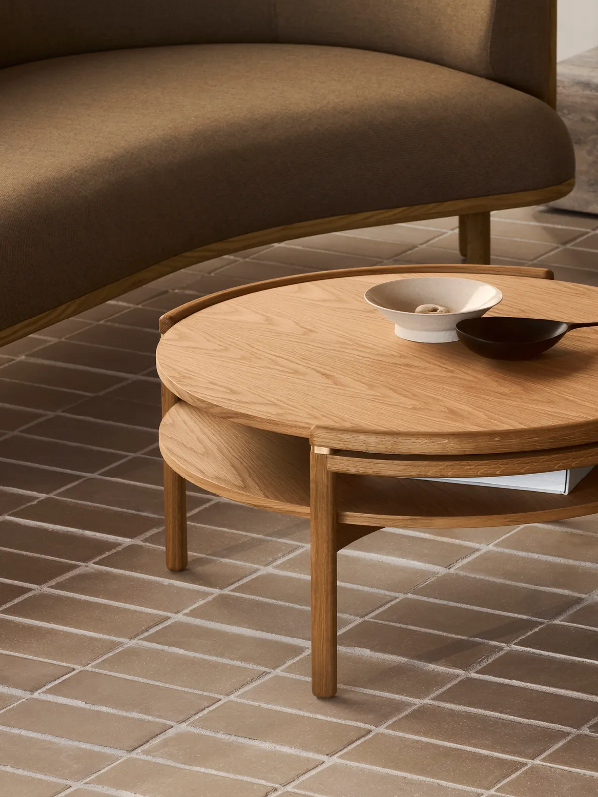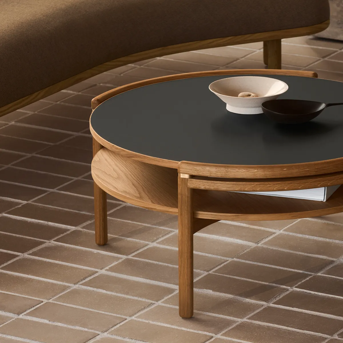 The round Sideways Coffee Table has a wooden frame and a reversible tabletop with two different surfaces in either oak or walnut on one side and laminate on the other. There is also a version in Italian marble. The tabletop rests on brass fittings that contrast beautifully with the wooden frame. Rikke Frost has designed the Sideways Coffee Table with a shelf, which allows you to put your mobile, iPad or remote aside, and, instead, enjoy the present and being offline.