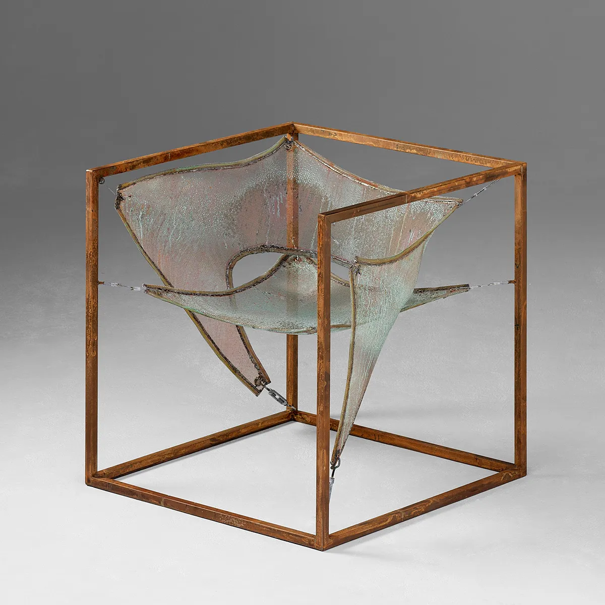 The Wind easy chair by Sigurdur Gústafsson for Källemo (2003) features a steel frame with patinated brass net for the back and seat, limited to 33 numbered pieces. This innovative seating design demonstrates Gústafsson’s exploration of mesh materials and metal patination techniques. The Wind chair’s transparent quality and weathered brass finish reflect the designer’s interest in time’s effect on materials, creating seating that embodies both contemporary innovation and aged beauty.