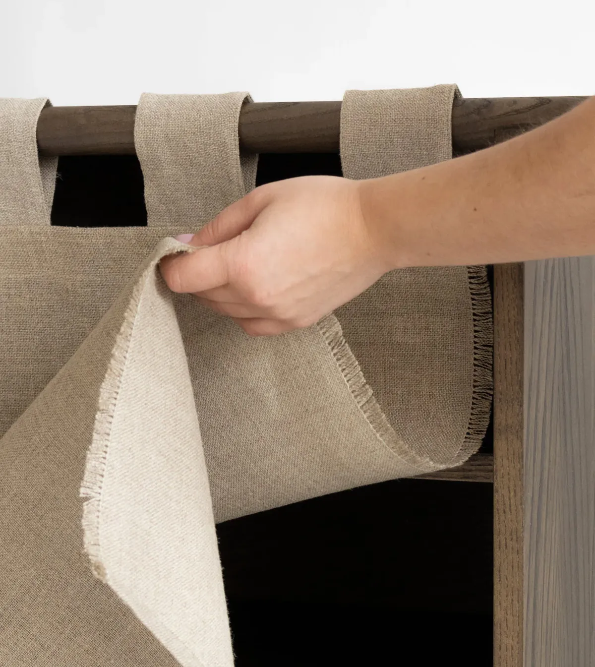 Designer Silje Nesdal examining the linen detail of her Veil Cabinet creation for Origin Made. The complete Veil Cabinet collection by Silje Nesdal for Origin Made, featuring both tall and low versions in harmonious arrangement. Close-up detail of the Veil Cabinet's natural linen door panel and elegant joinery, highlighting Origin Made's quality craftsmanship. Designer Silje Nesdal examining the linen detail of her Veil Cabinet creation for Origin Made.Veil Cabinet by Silje Nesdal integrated into a serene living space, demonstrating its versatility and elegant presence.