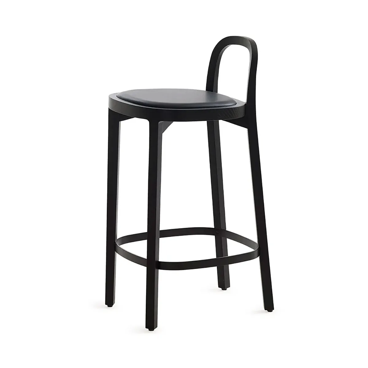 The Siro bar stool is beautifully proportioned high stool with a backrest lowered as if it was a handle. It’s made of oak and finished with a wax or stained black. The footrest is brass or black painted metal. There is a choice of wooden or leather upholstered seat.