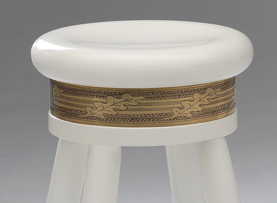 Skepparpall by Mats Theselius for Källemo exemplifies Scandinavian design excellence. This limited edition ship’s stool features turned beech wood lacquered in black, white, or blue, enhanced by engraved brass band and brass leg details. With only 360 pieces produced, the design combines maritime inspiration with functional elegance, showcasing Theselius’s mastery of form and material. The piece represents a significant collaboration between Sweden’s leading furniture designer and manufacturer.