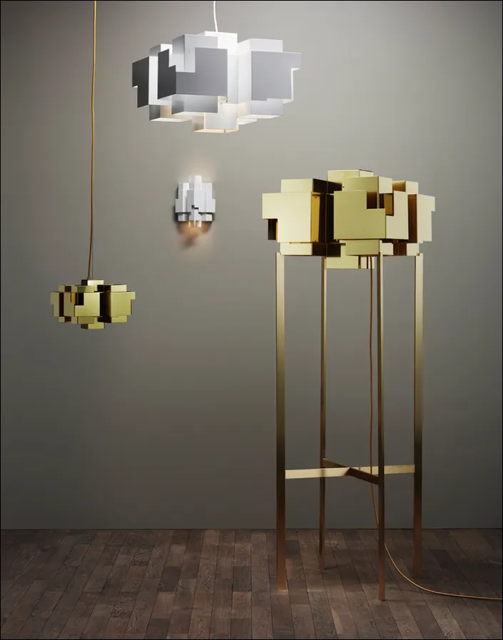 The lamp reminds of a stylized, airborne city, a modern crystal chandelier, an edgy, corrugated apparition, all together inspired by the skyline.