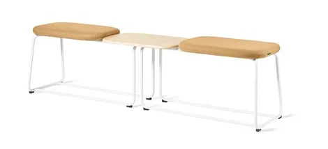 Bench with two upholstered seats and a table top. Frame in white lacquer (RAL 9016), black lacquer (RAL 9005) or chromium. Skandiform standard lacquers (RAL) as option. Table top in oak or white pigmented ash.