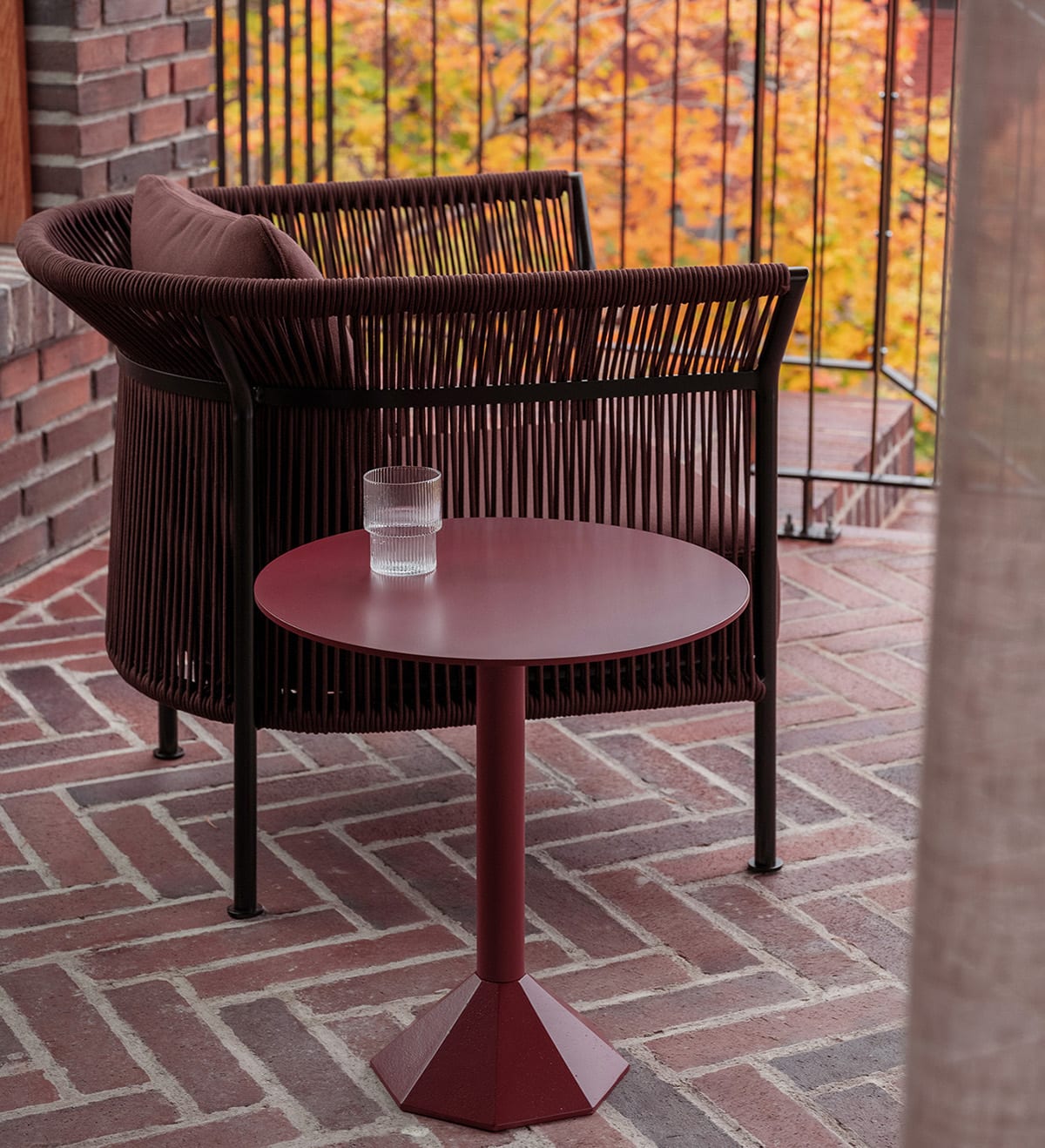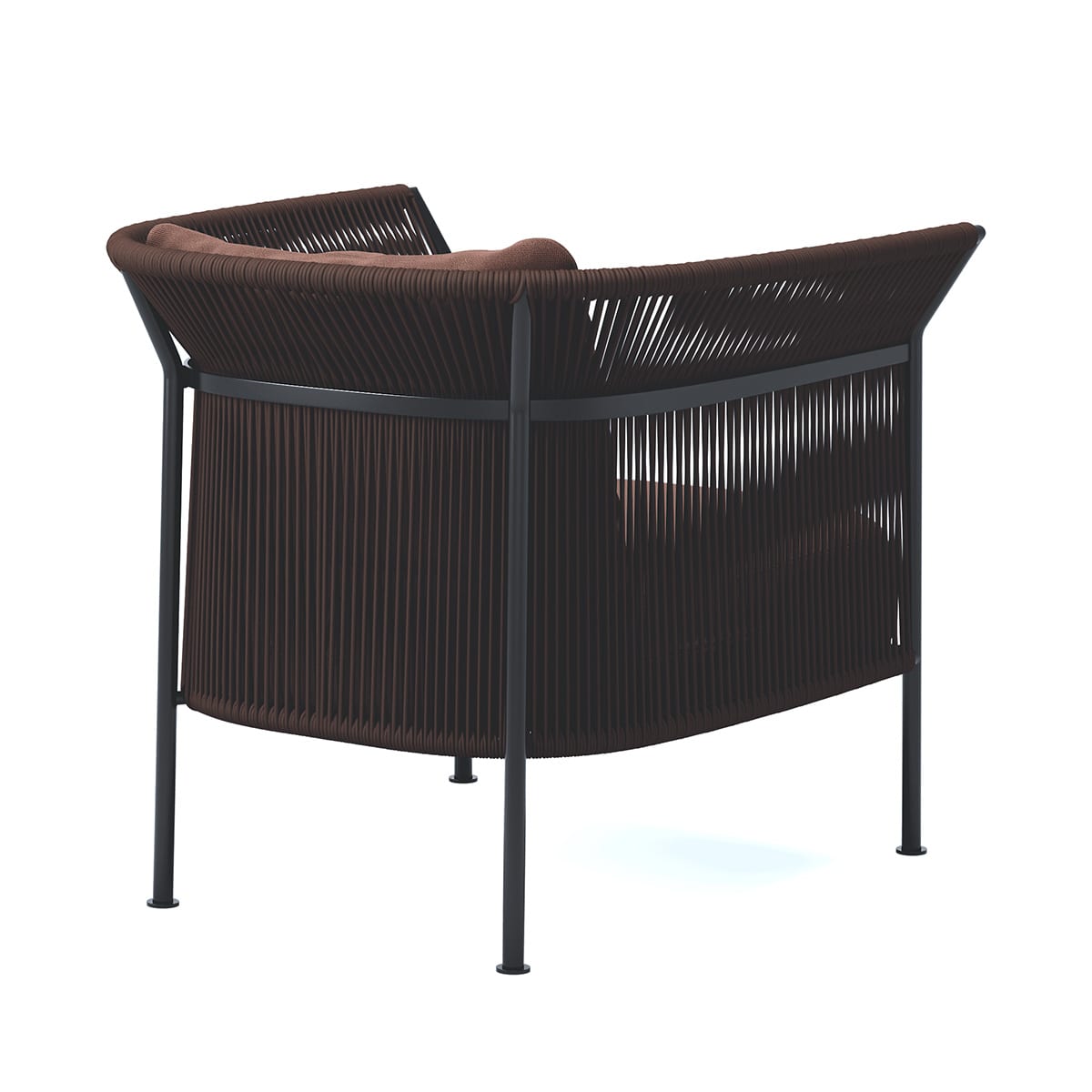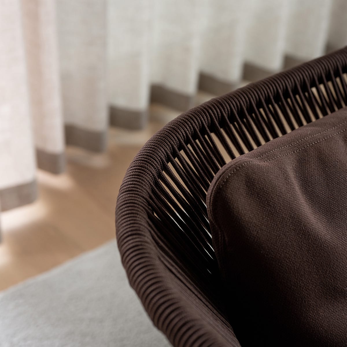 The material combination makes the chair light in both weight and visual presence, while olefin’s durability means it holds up equally well indoors and outside. The result is a piece that moves freely between domestic interiors, covered terraces, and outdoor environments without requiring separate product ranges for each context.