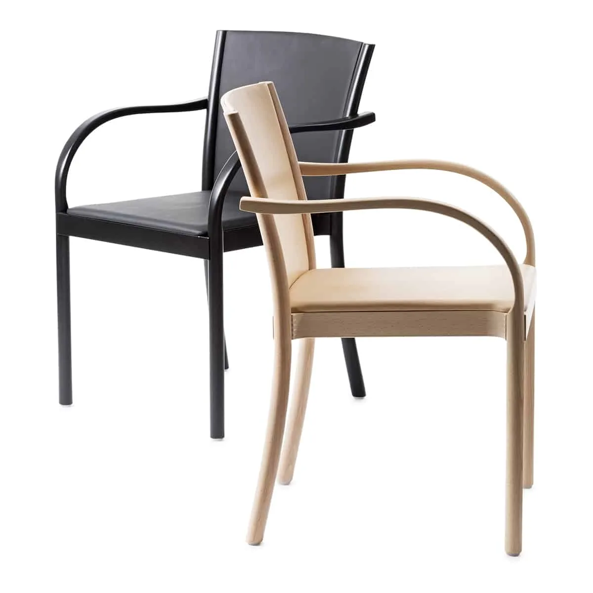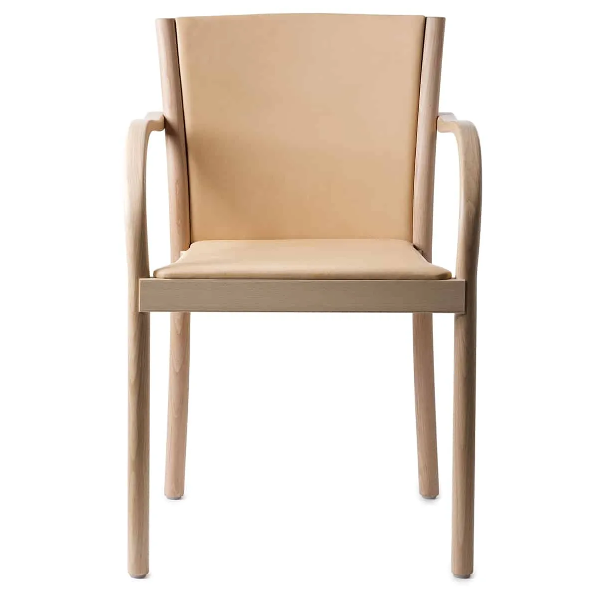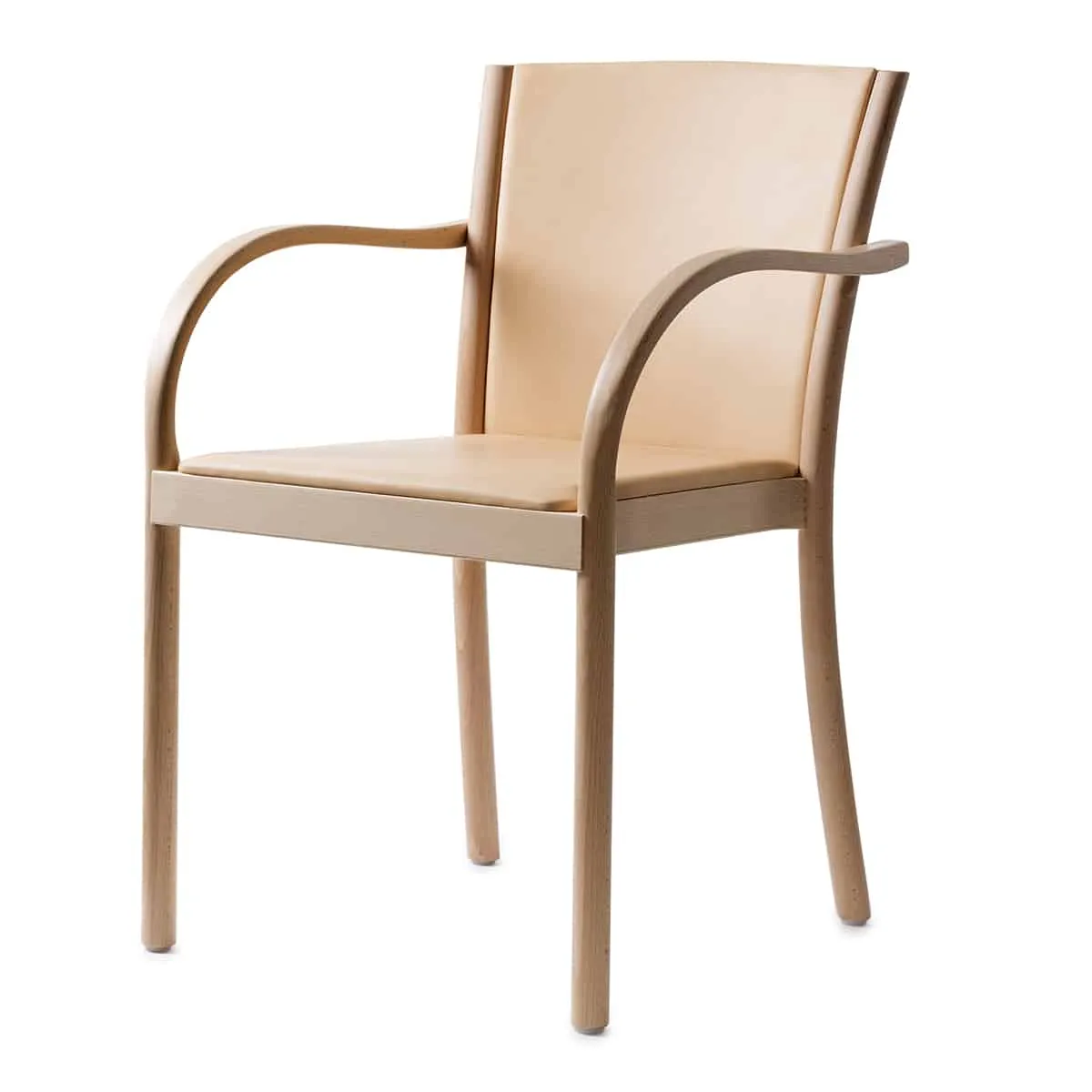 Armchair of bent solid beech. Upholstered seat and back, in fabric or leather. Stackable and linkable.
