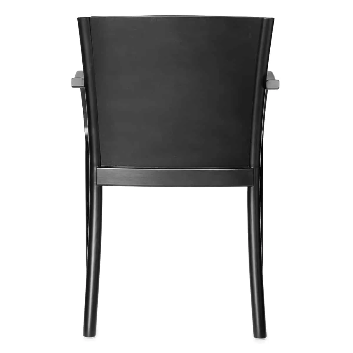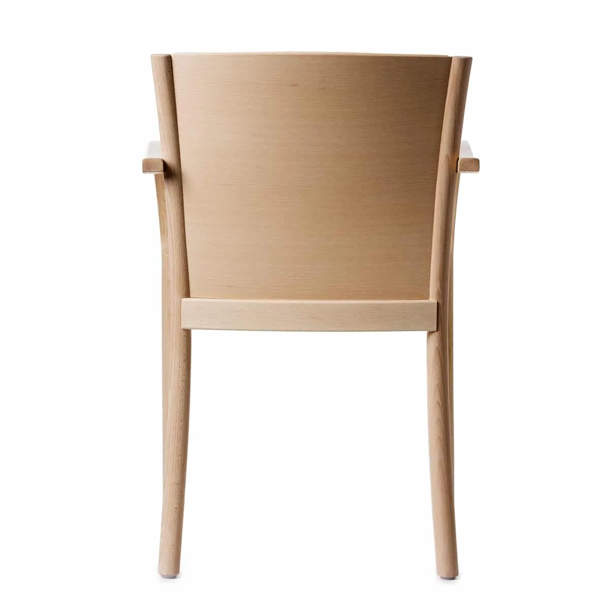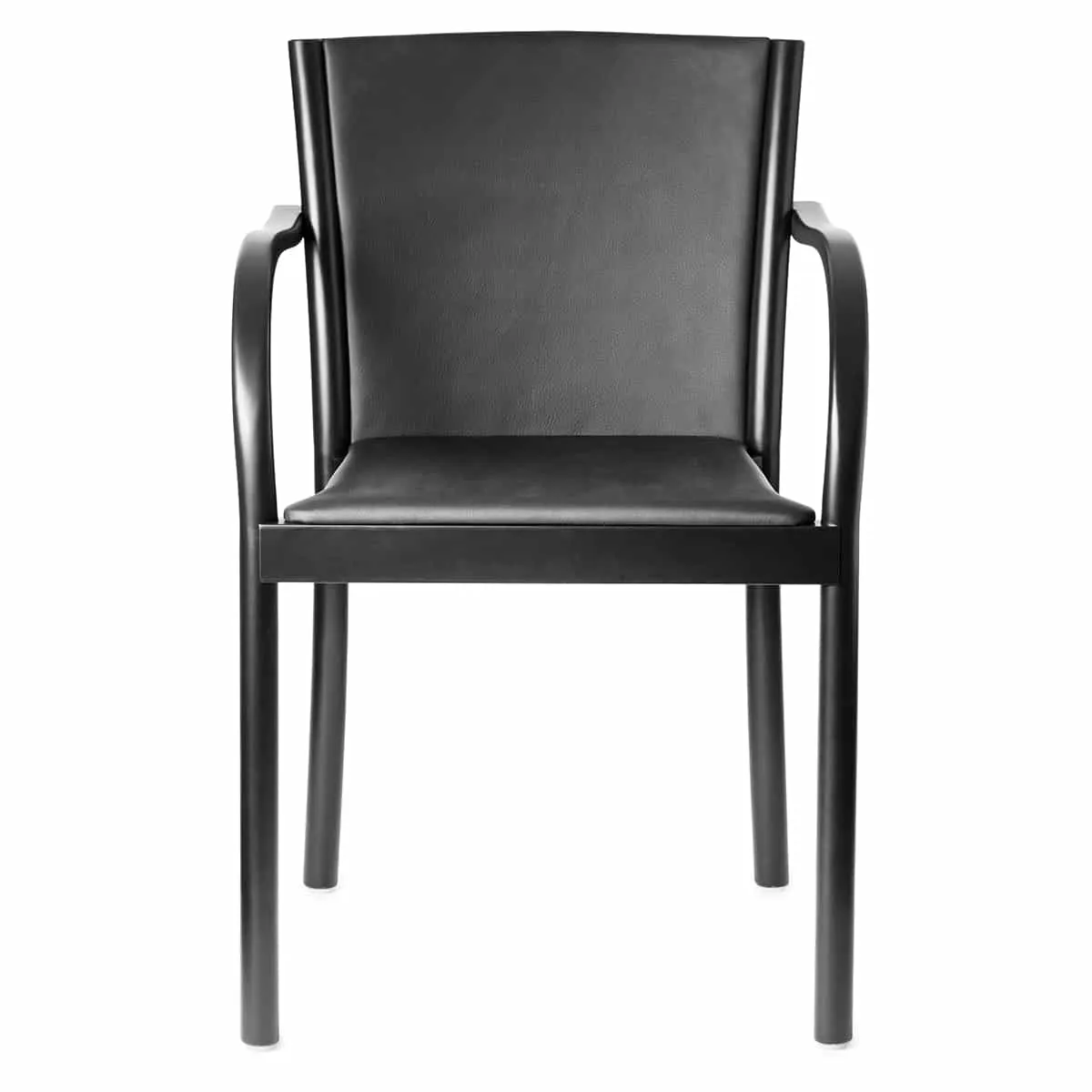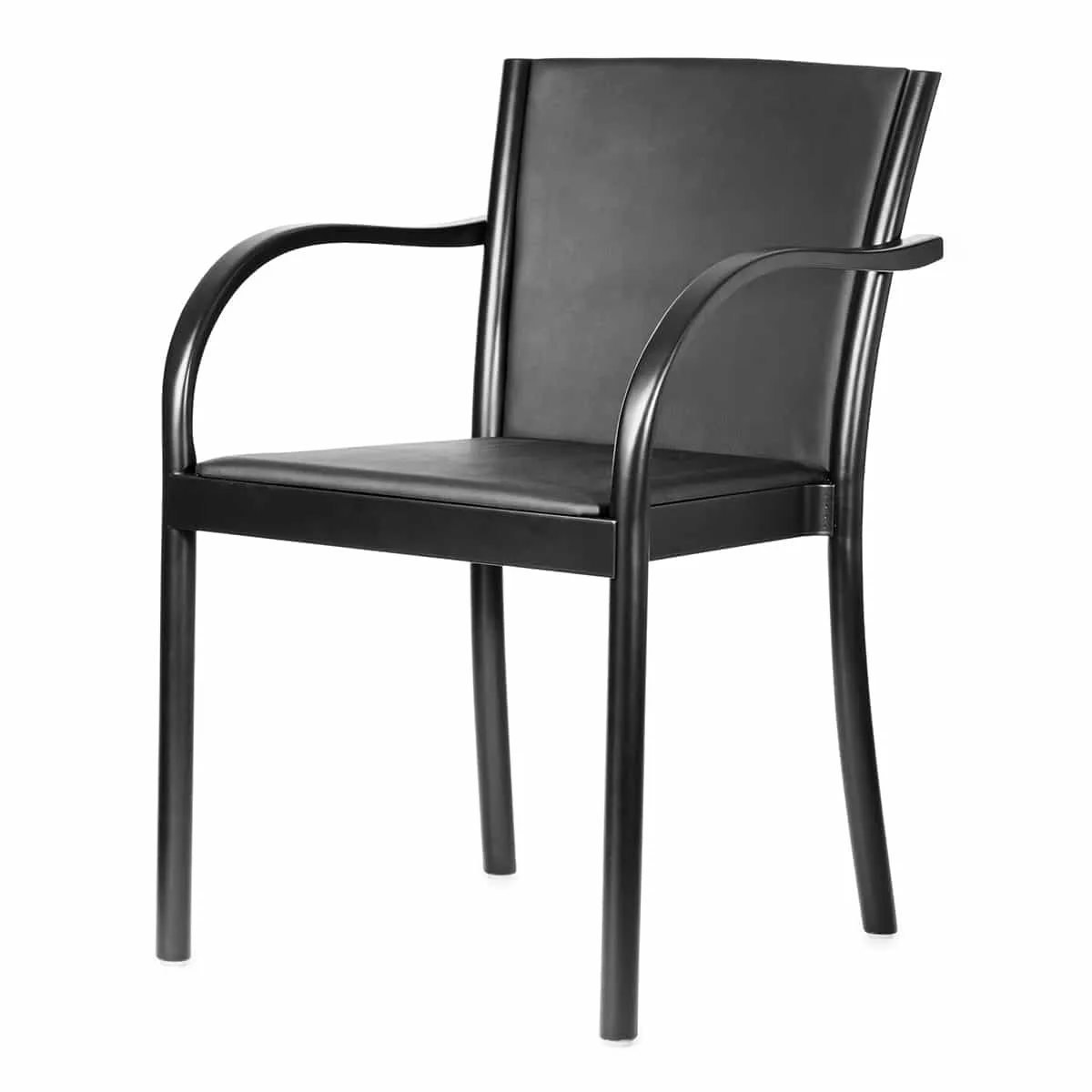 Armchair of bent solid beech. Upholstered seat and back, in fabric or leather. Stackable and linkable.