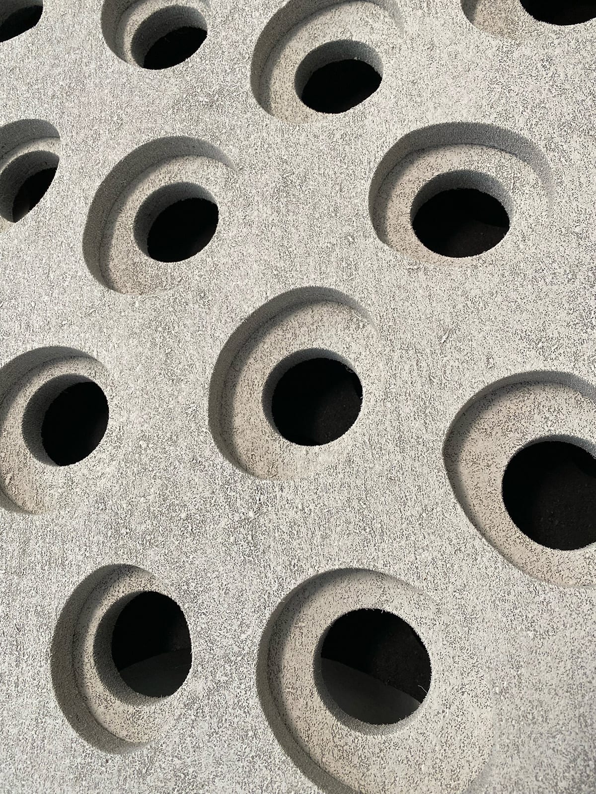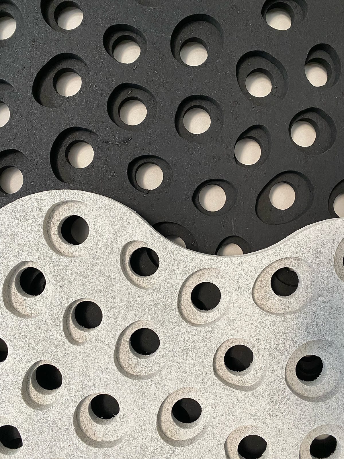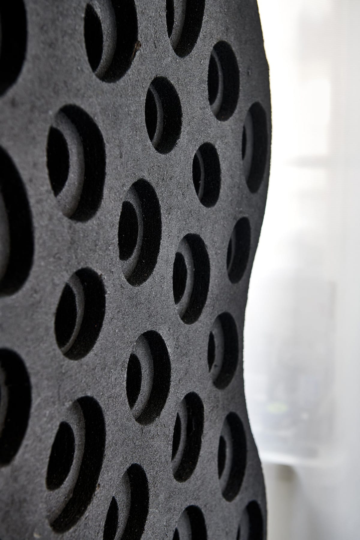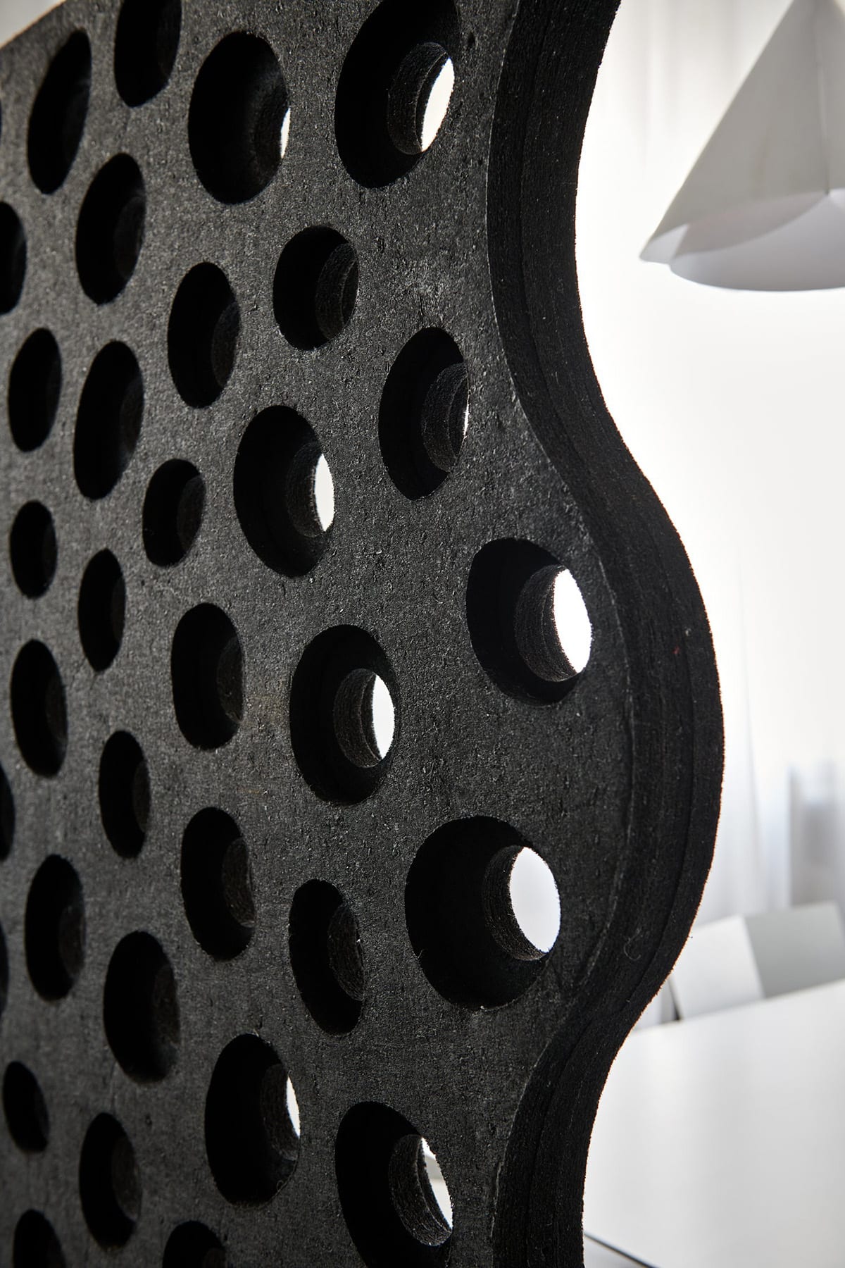 Three sound absorbing panels of peat have been joined together where Ingegerd has created cavities in two layers. The repetitive pattern is varied through two different sizes of holes, the smaller hole is repeated strictly schematically and the larger ones are drawn entirely by hand, giving Sound Of Silence the best possible sound absorbing effect and a soft and lively surface.