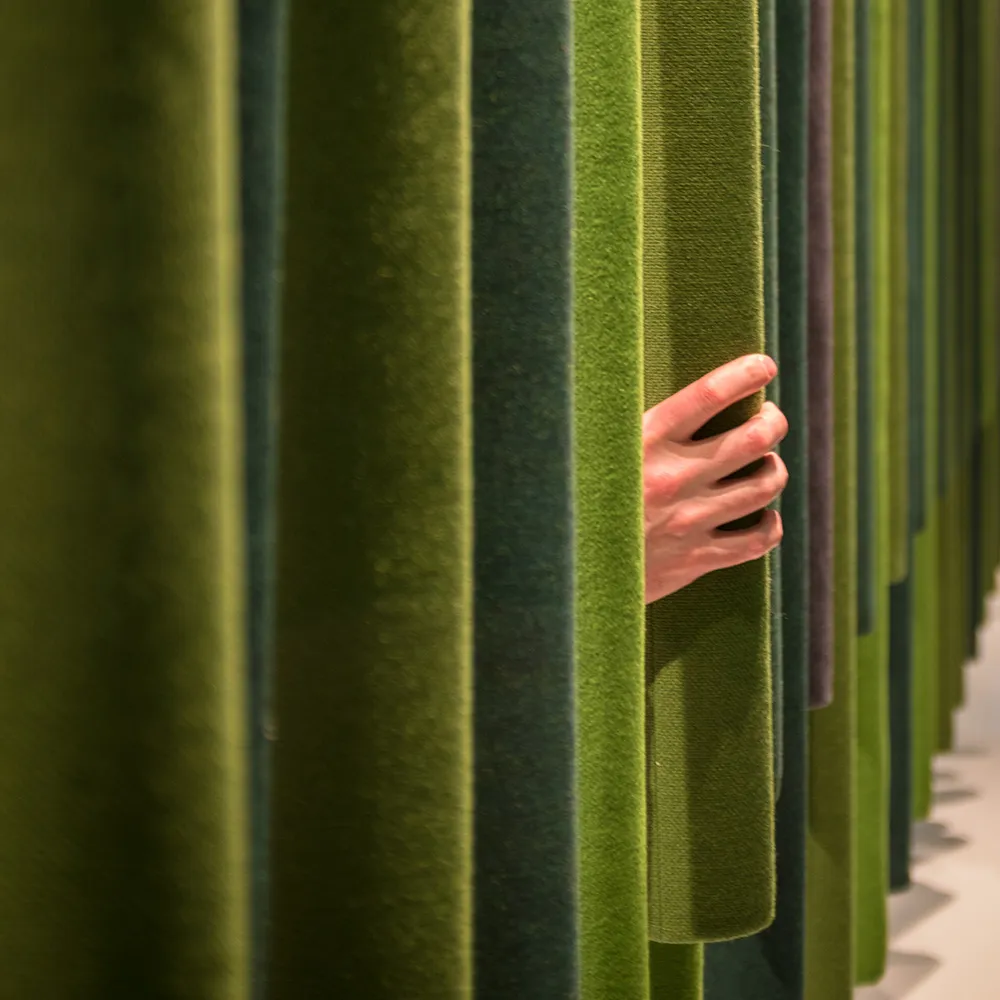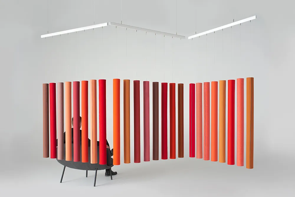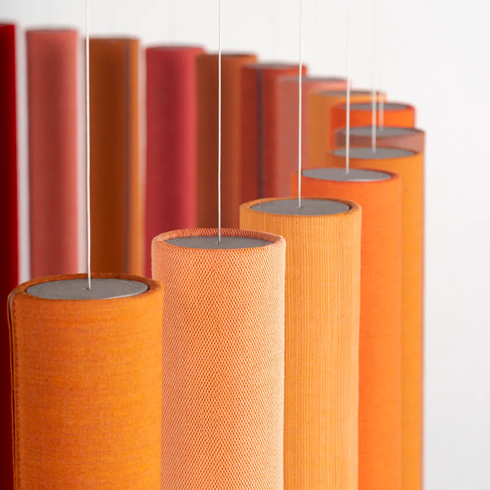 Soundsticks® was launched in early 2019 after two years of development in collaboration with designer Andrea Ruggiero. Made of textile scraps molded into the shape of a tube, Soundsticks® are covered with left-over textile from production and held together at the ends by recycled aluminum caps. This unique product can be hung from rails in a linear or radial pattern depending on need and space.