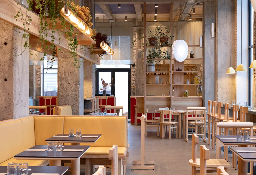 The minimalist interior pairs custom elements, such as wooden furniture, exclusively designed by Spacon & X and produced in collaboration with German design pioneer e15, with bespoke artwork, handcrafted seaweed lamps made in collaboration with the Danish designer Jonas Edvard, and a warm colour palette of poppy reds, dusty greens and meadow flowers to reflect Denmark’s four seasons and POPL’s seasonal menu. Honouring the integrity of natural elements, the restaurant’s ethos is expressed both through local ingredients on the plate and material honesty in the design.