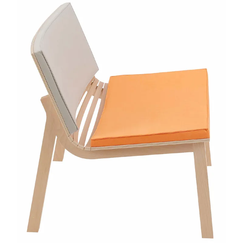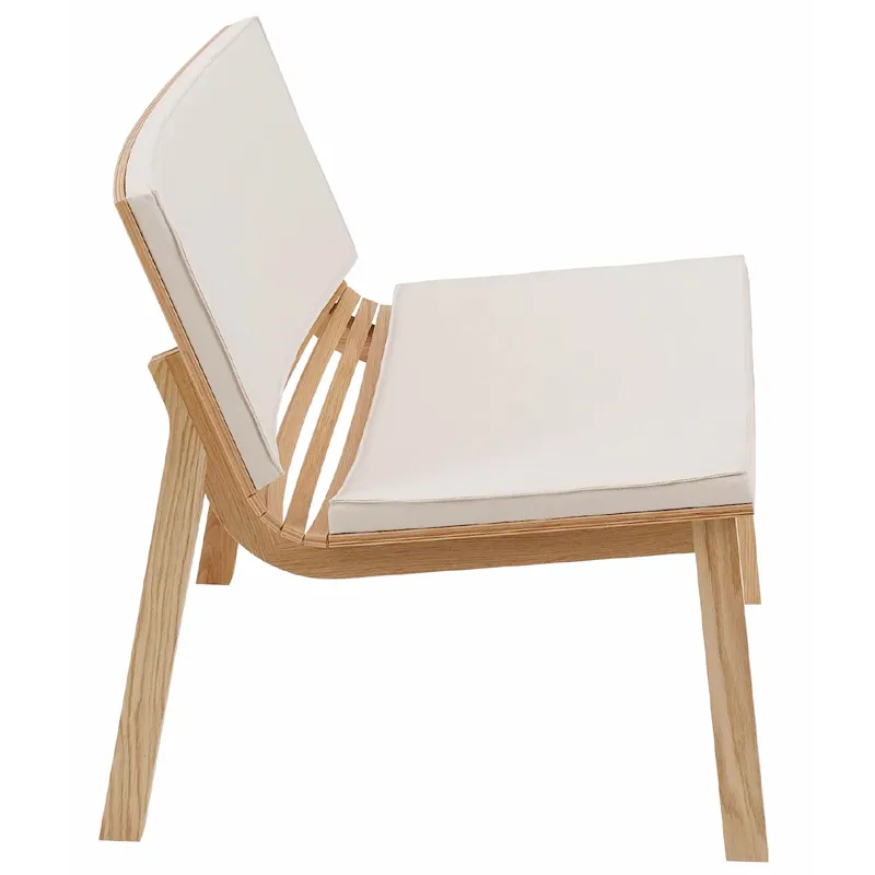 ”The form of Split comes from the technique of folding a flat plane into a curve through the introduction of a number of slits. By removing material, the slits become voids and a pattern of wooden ribs emerge on the seating curve to characterize this technique.