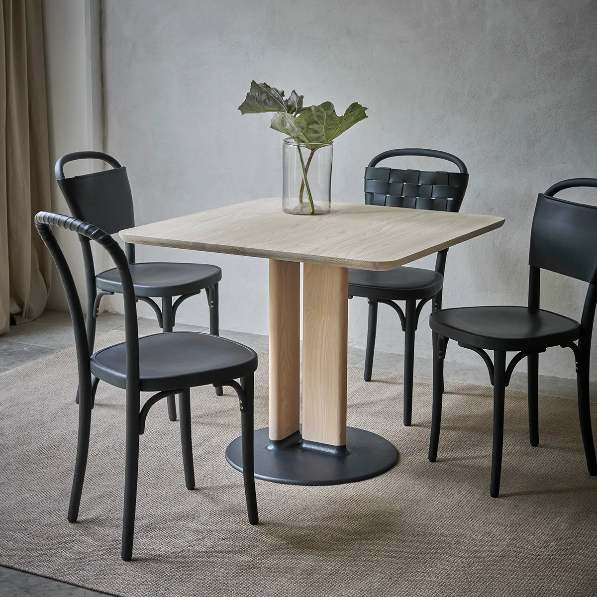 A gently sculptured base which stands steady on the ground, with two pillars balancing the elgenat table top in solid ash.