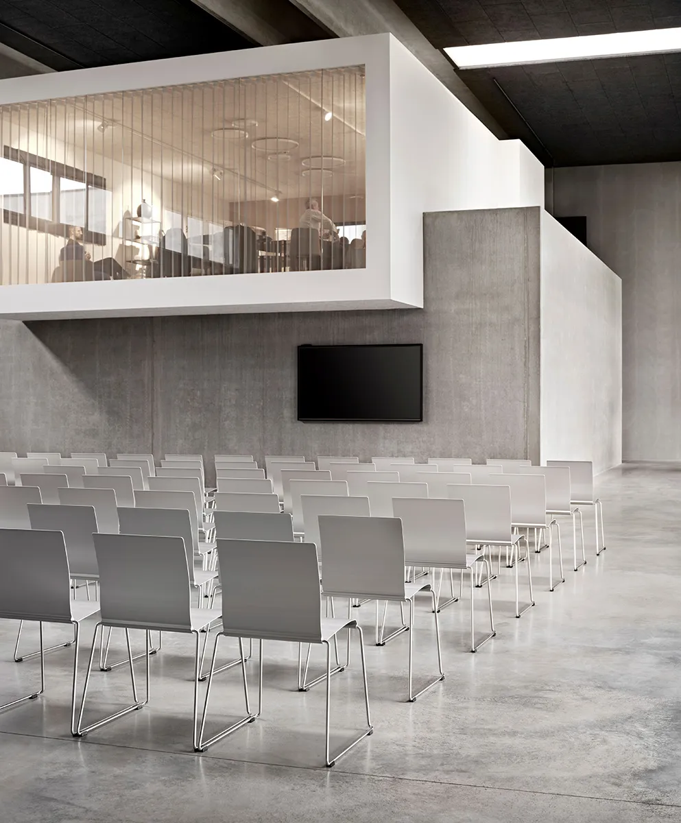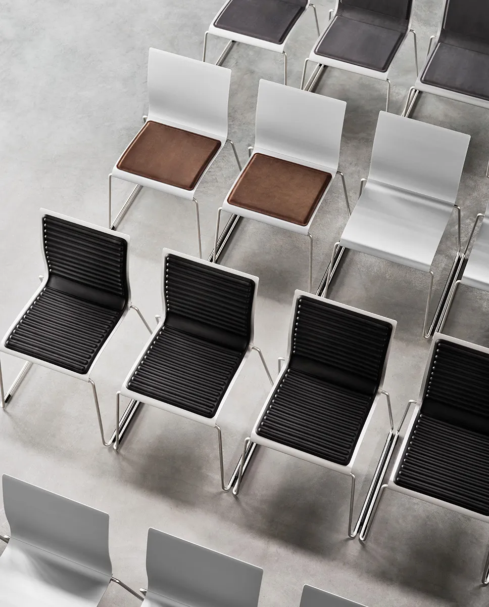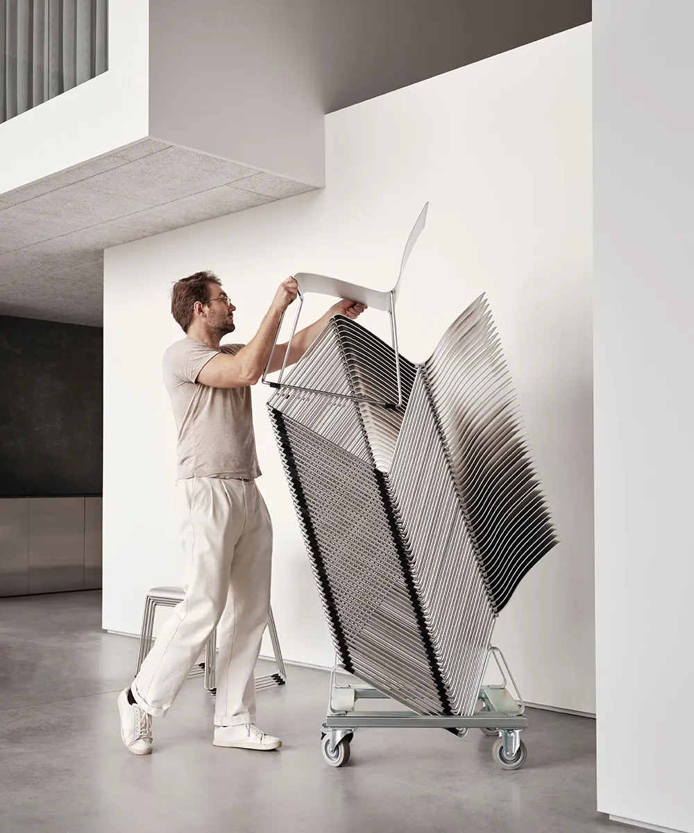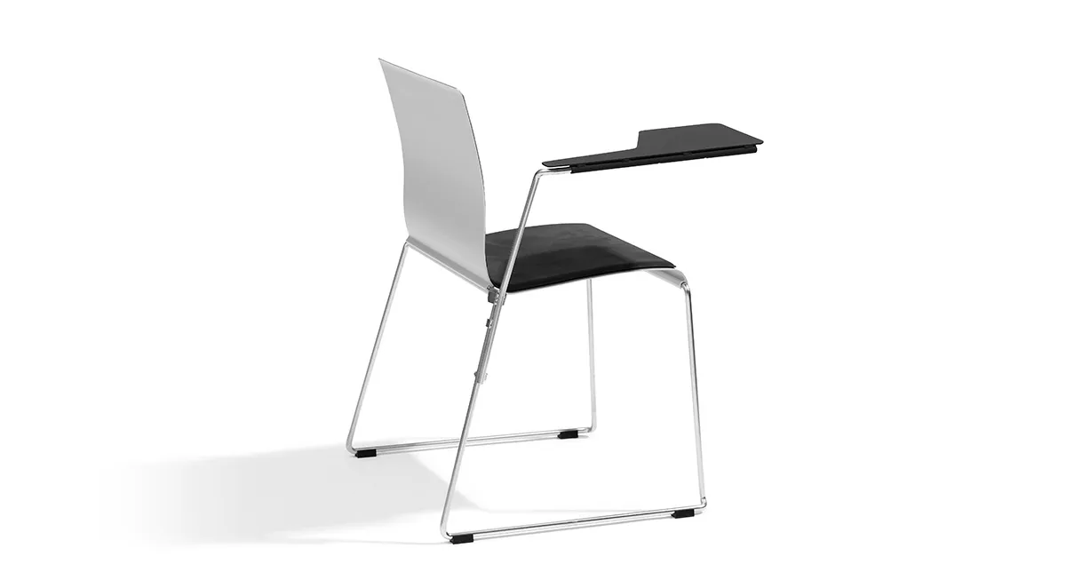 The aluminum is now sourced almost exclusively from reused material processed at Hydro’s remelting facility in Sjunnen, Sweden. The profiles are made in Hydro Restore which consist of 90% recycled aluminium and Sting is 100% recyclable. The weight of one chair is only 6kg and it stacks up to 50pcs in a trolly, easy to store away when not in use. It is linkable and comes with various seat pads and an attachable writing table. Sting is also available with armrests for projects.