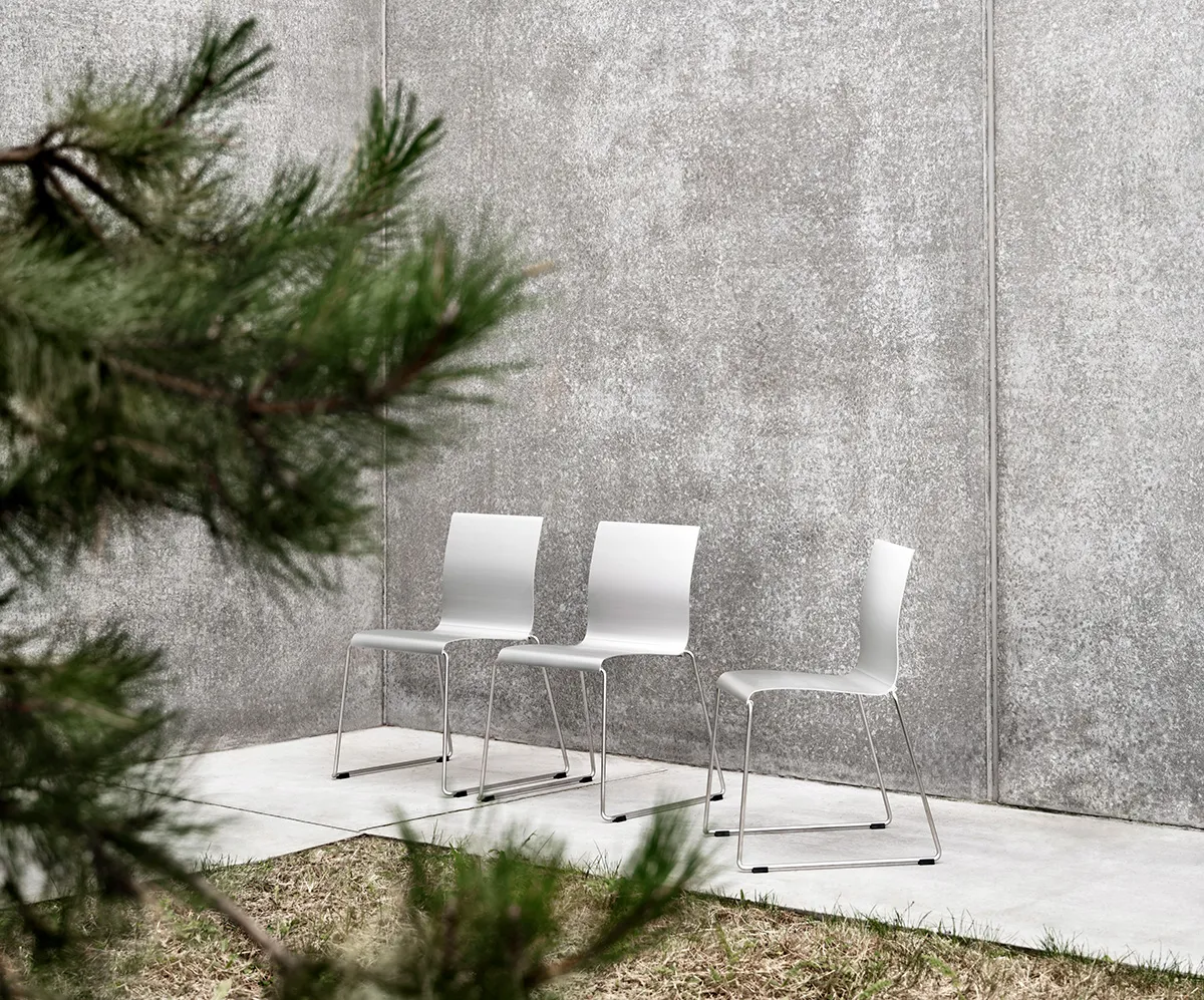 Made in just two materials: aluminum and stainless steel. At home indoors as well as outdoor. Sting has that perfect tilt of the backrest. Now Fredrik Mattson and Stefan Borselius’ stackable and linkable chair is back in business with the same exact profile and its very precise graphic language.