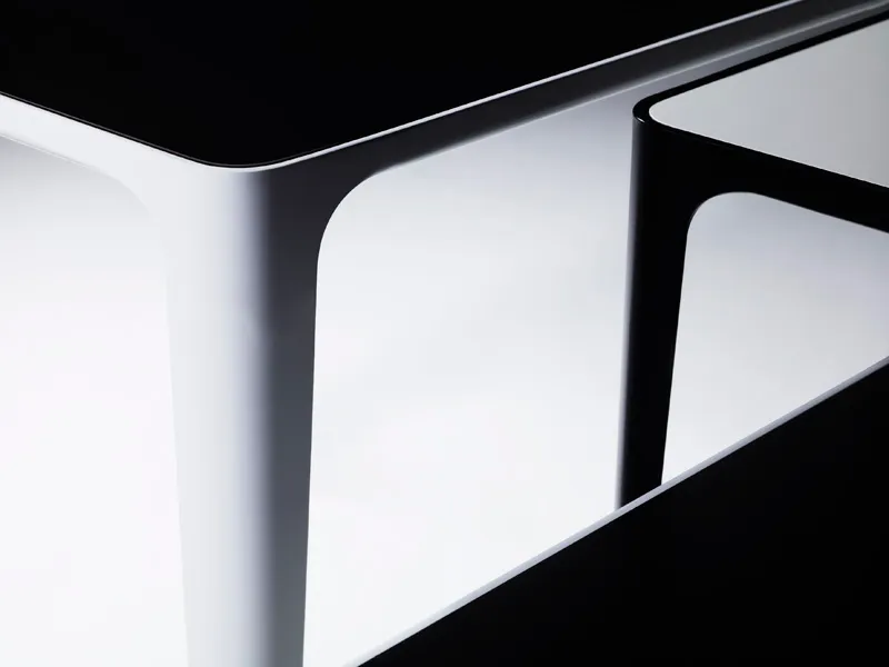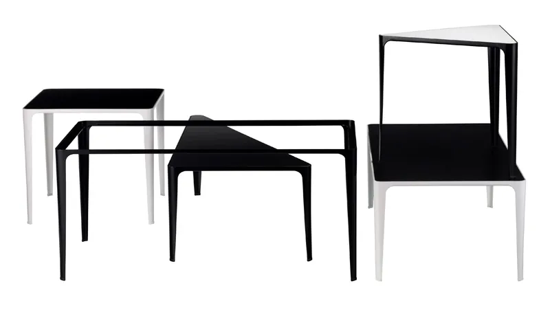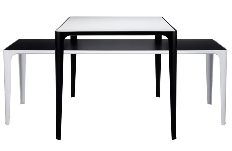 – table in four different sizes, each of them in two different heights – 34 and 45 cm. Steel frame in black- or white lacquer finish and table top in laminate. On three of the sizes the table top comes reversible with one side in white and the other side in black. On the fourth size you must decide your choice of colour table top from the beginning.