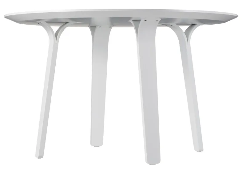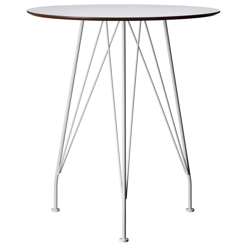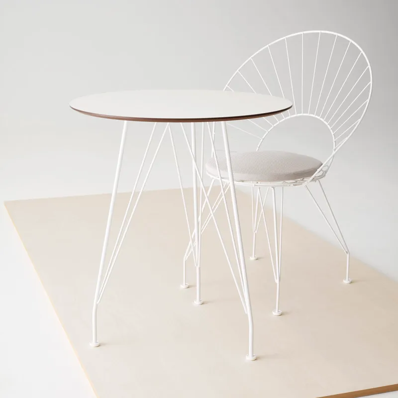– café table Ø 64 cm. Table top in white laminate, with white lacquered steel base. For outdoor or indoor use. Adds to the series including the Desirée chair, designed by Yngve Ekström 1954, and re-launched by Swedese a year ago.