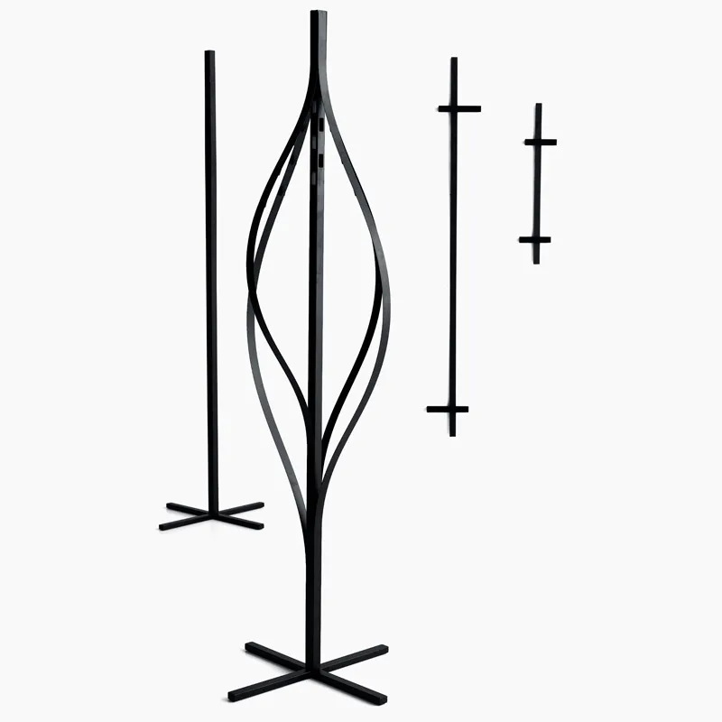 Strip designed by Ulf N Jevin, 2010. This spring steel coat-hanger is available in both wall-mounted and free-standing versions. The wall-mounted Strip comes in a choice of two sizes: 760 mm high (with two hooks) and 1800 mm high (with three hooks). When not in use, it is merely a discreet decorative metal strip that lies flat against the wall. Perfect for halls, offices and hotel rooms. The free-standing model has four spring steel strips around a central pillar. You can hang coats and clothes on all four sides, or just use the number of strips you need. Each spring steel strip has four hooks, making a total of twelve on the stand as a whole. Strip is an ideal solution wherever space is limited and is just as much at home in the kitchen or bathroom as it is in the hall, corridor or conference room. Use it as an extra coat-hanger when lots of visitors turn up – in exhibition premises and conference facilities. Strip comes in a choice of a black or snow white finish.
