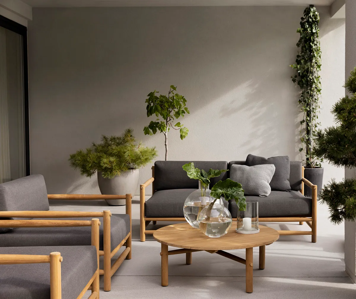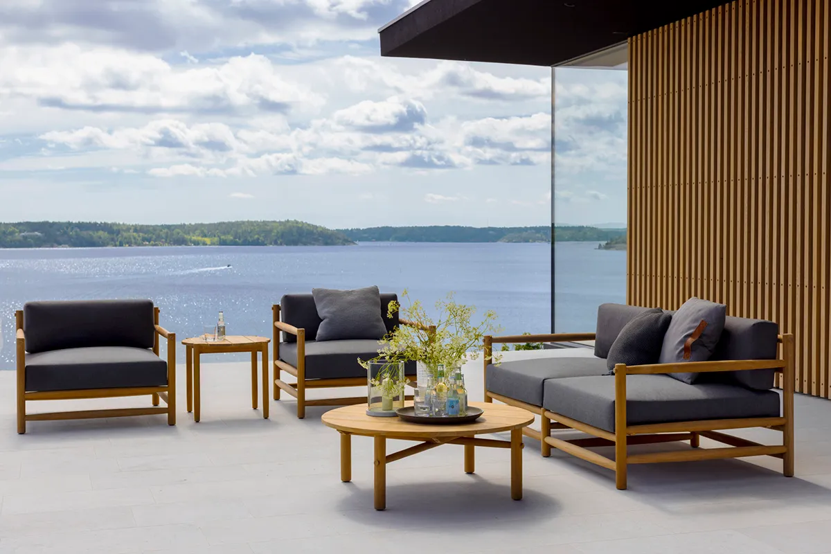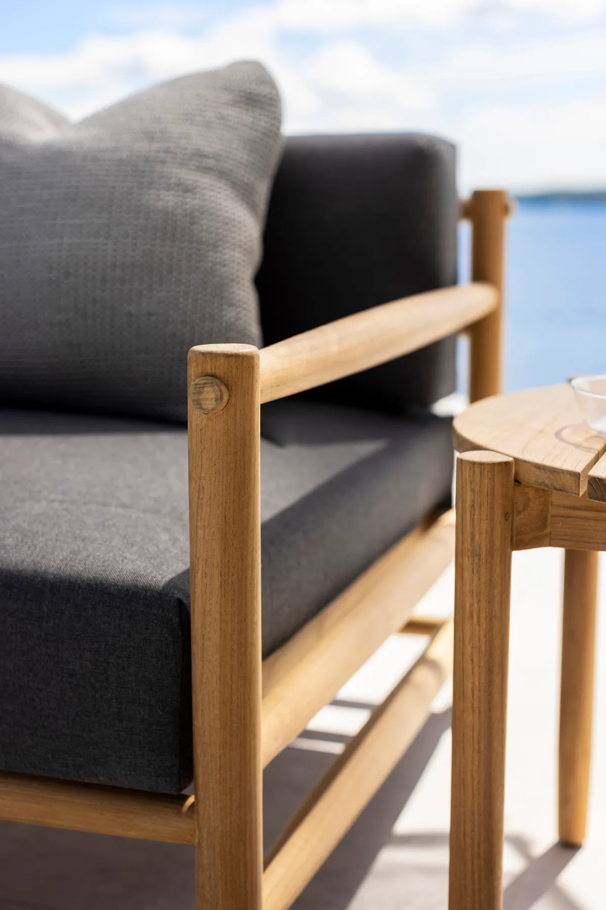 The Saltholm Sofa provides generous seating for outdoor entertaining, while the Lounge Chair offers individual comfort. The Ottoman functions as footrest and occasional seating, and the Lounge Table maintains pure geometric clarity. FSC-certified teak ensures sustainable sourcing.