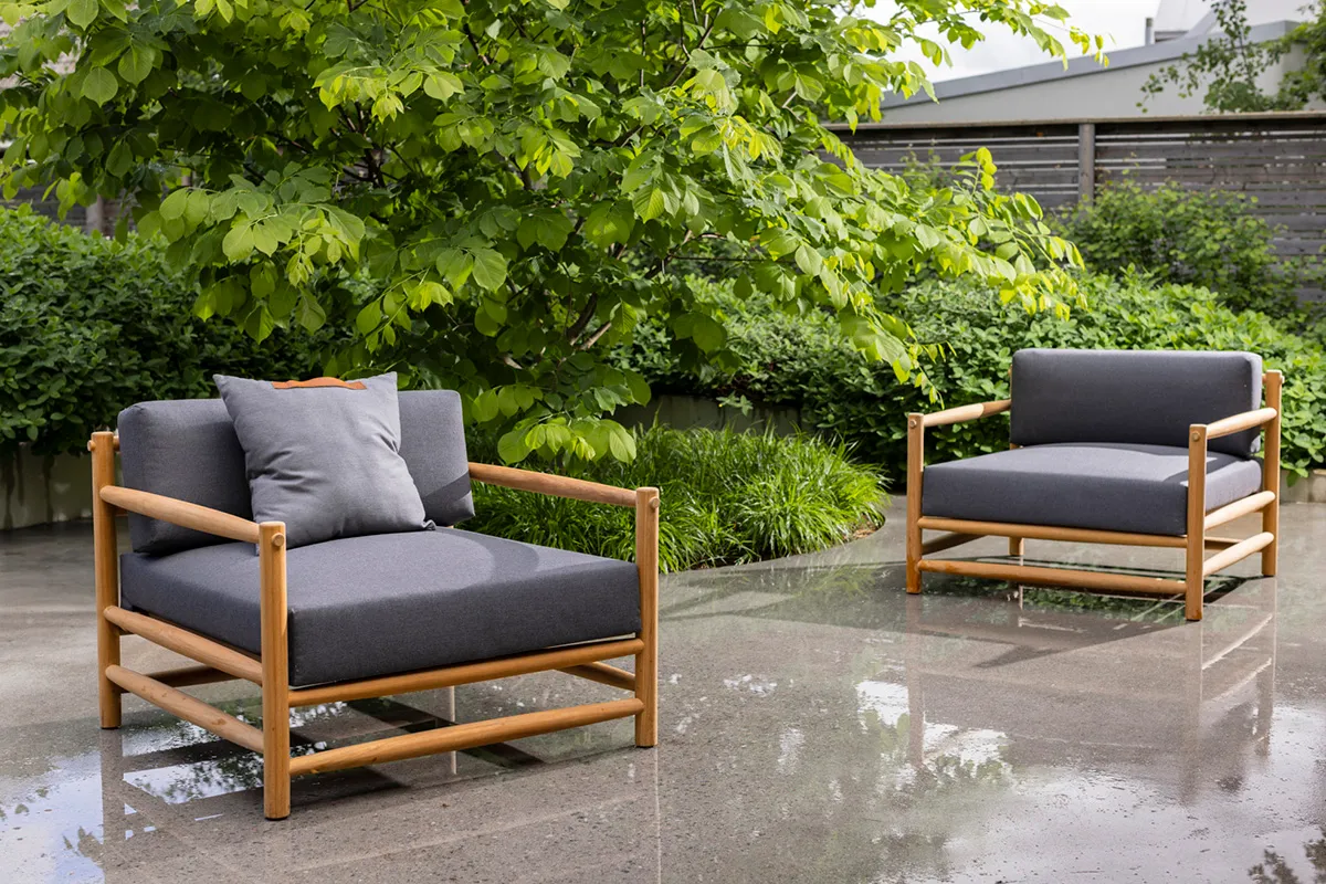 The design captures Saltholm island’s paradox of seclusion existing just ten kilometers from major cities. Studio Norrlandet deliberately created comfortable, inviting pieces rather than replicating the island’s austere landscape. The curved cushions contrast with the teak frames’ clean lines, offering both visual interest and physical comfort.