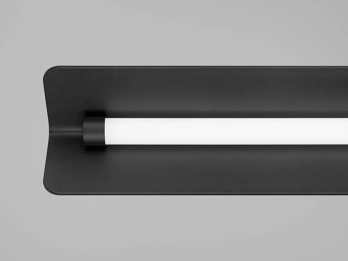 The slightly bent aluminum screen gives a discreet and floating expression at the same time as it clearly controls the light down on the work surface.