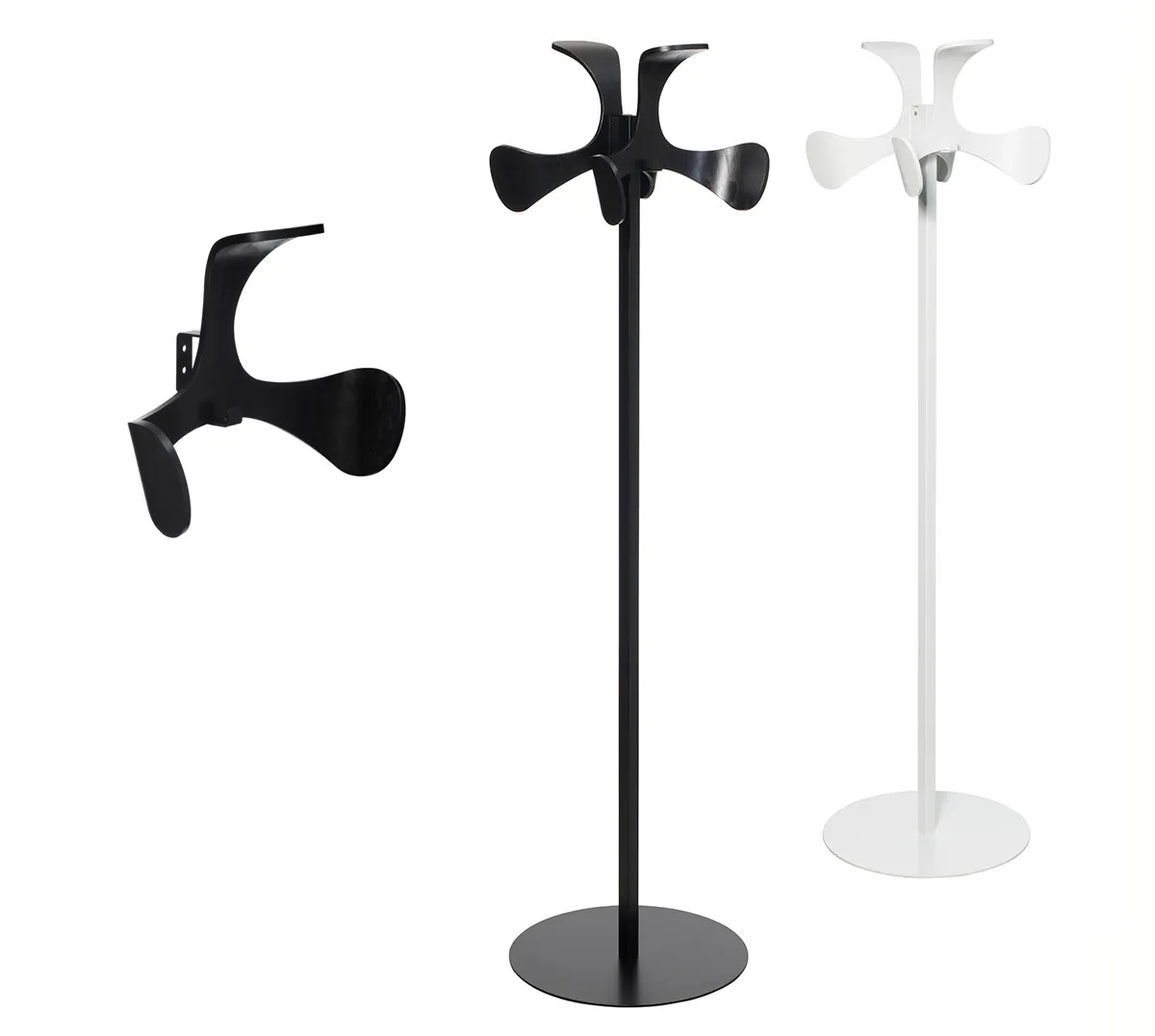 Hanahana, coat hanger, freestanding or for wall assembly, available in ash wood with white- or black lazur finish.