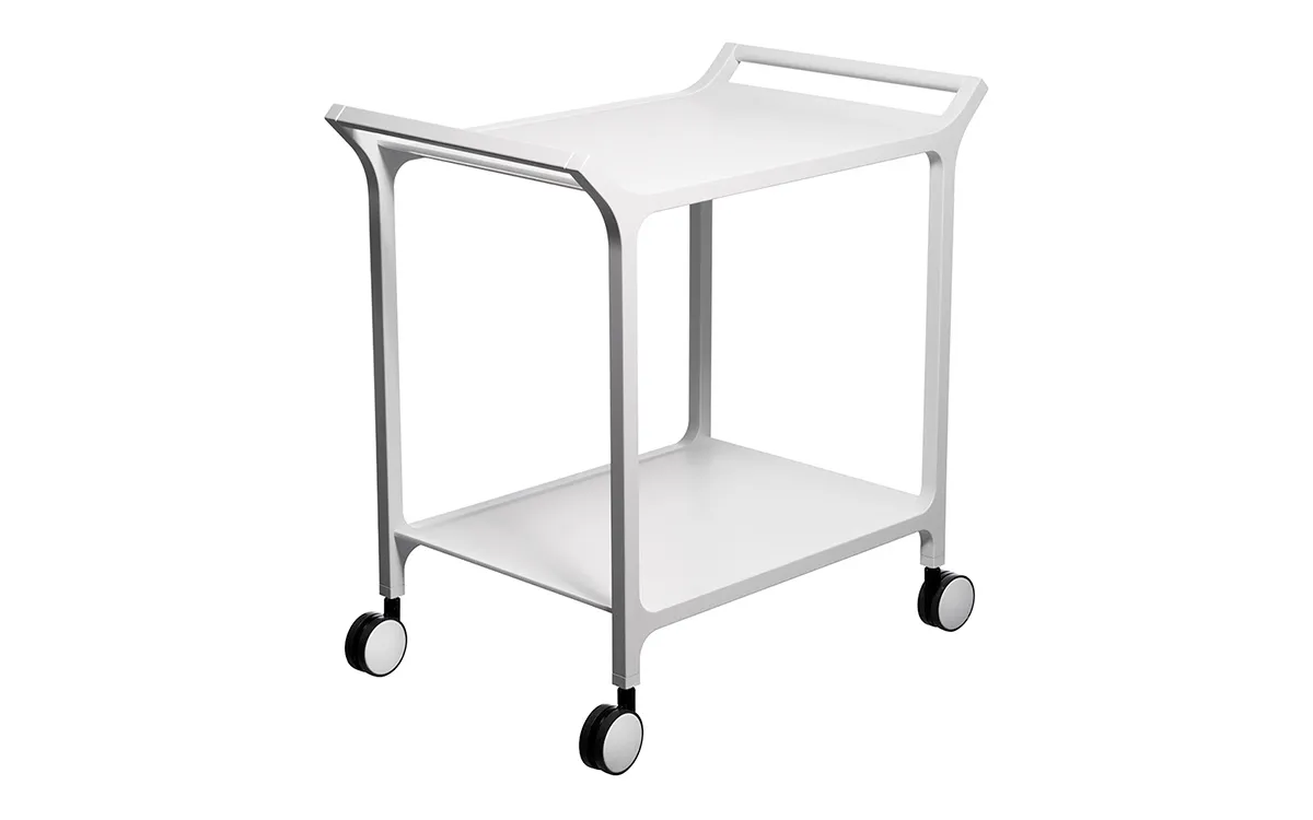 Teatime, trolley with frame in ash wood with white lazur finish, black lazur finish or clear lacquer. Scrath tolerant trays in white or black, where the top tray can easily be detached from the trolley.