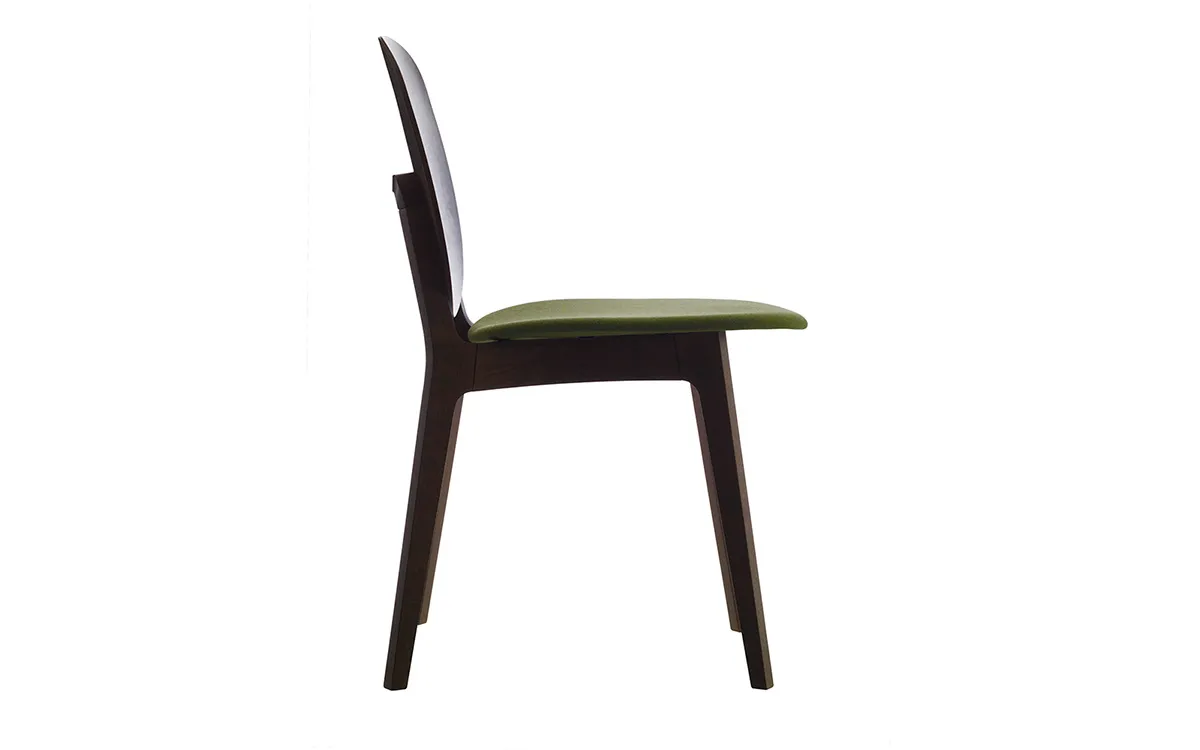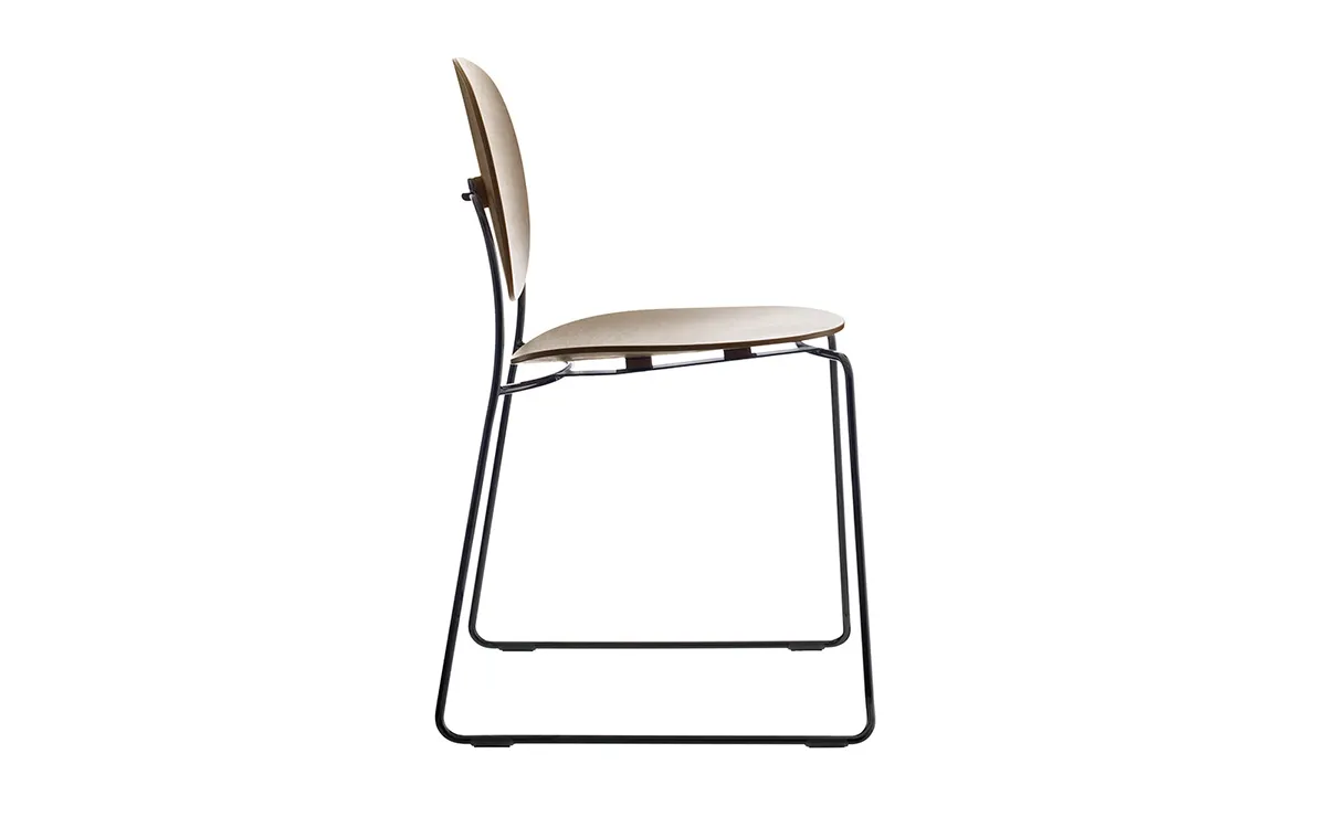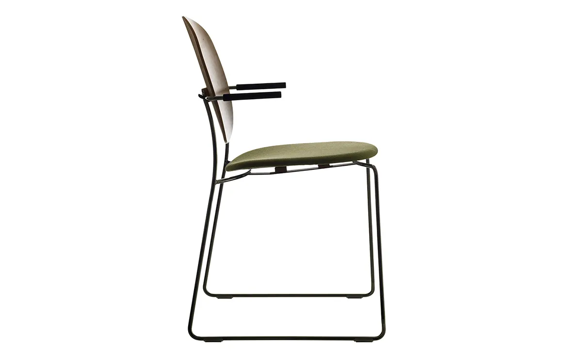 Olive wood, oak chair, with wooden seat or with upholstered seat. Olive metal, stackable chair and armchair in birch, on steel sled base in chrome finish, with wooden seat or with upholstered seat. The seats and backs of the Olive chair/armchair are created in twenty individually different design expressions.