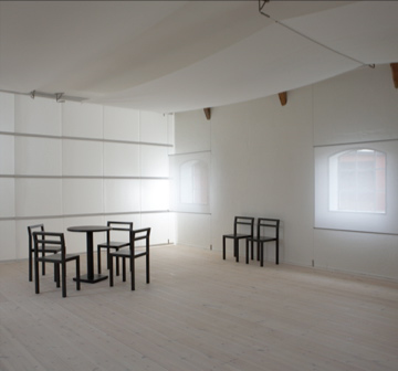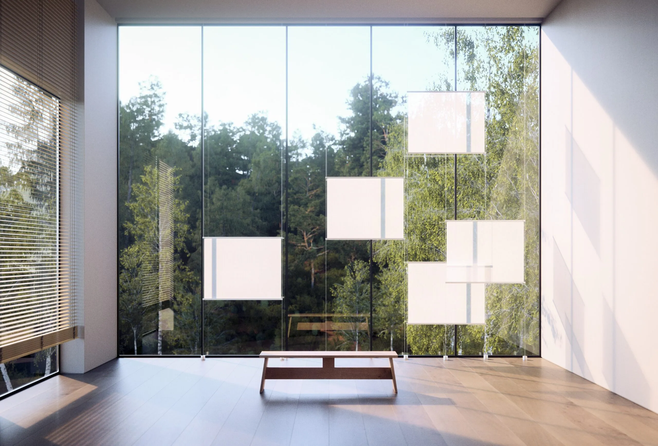 The design concept focuses on adjustable textile elements that can be moved freely rather than covering the full space between floor and ceiling. System W functions as both a sun shade and partial room divider.