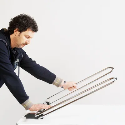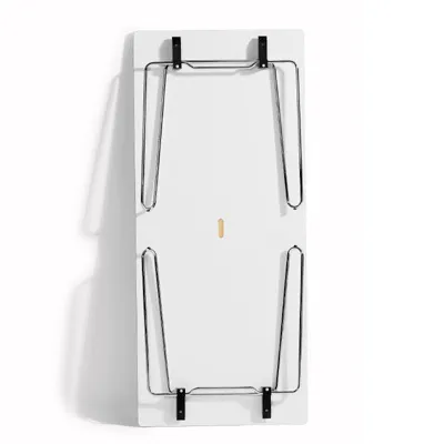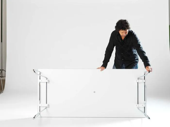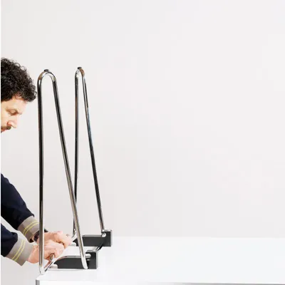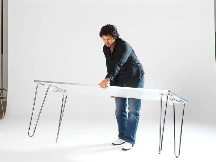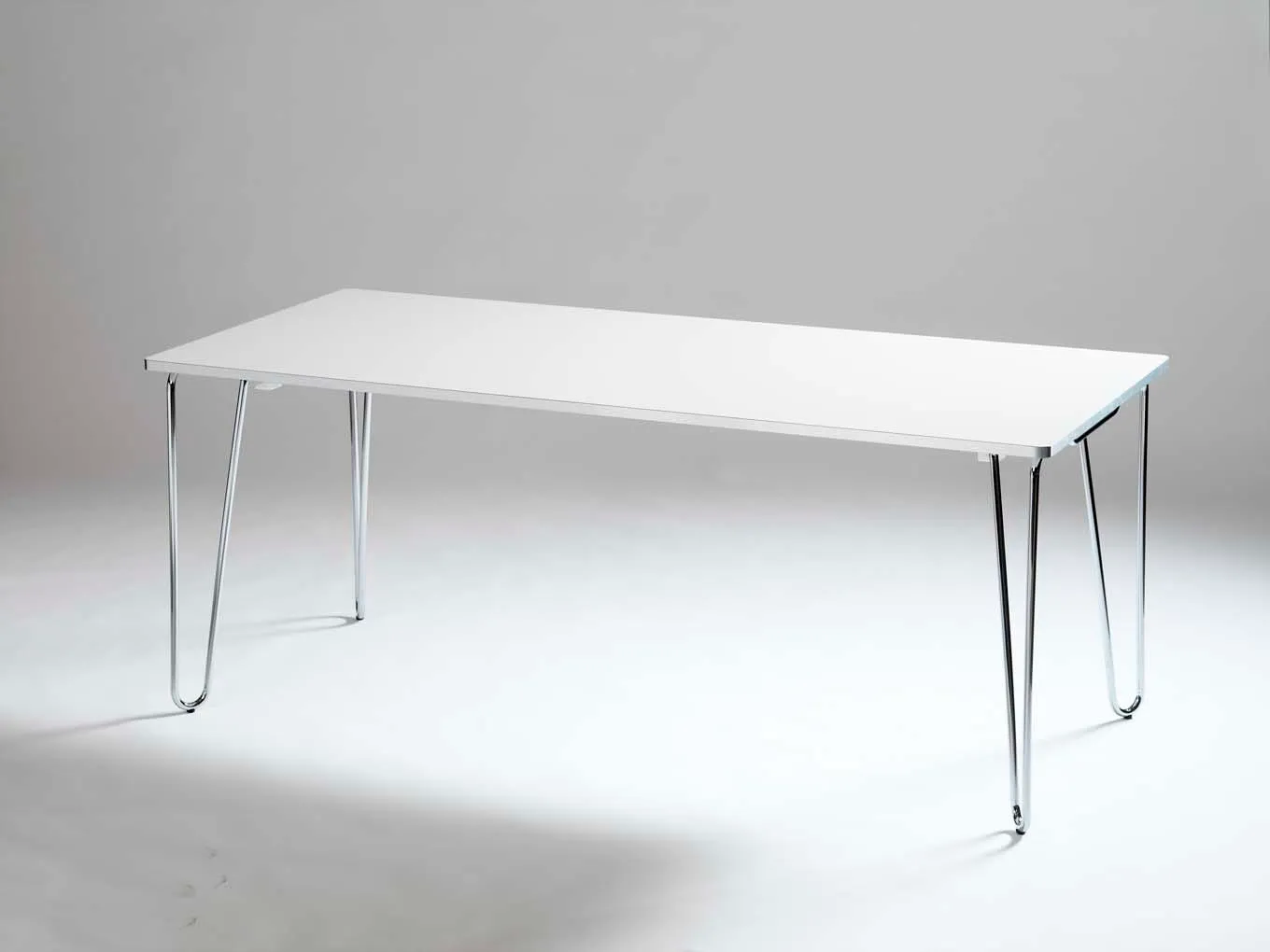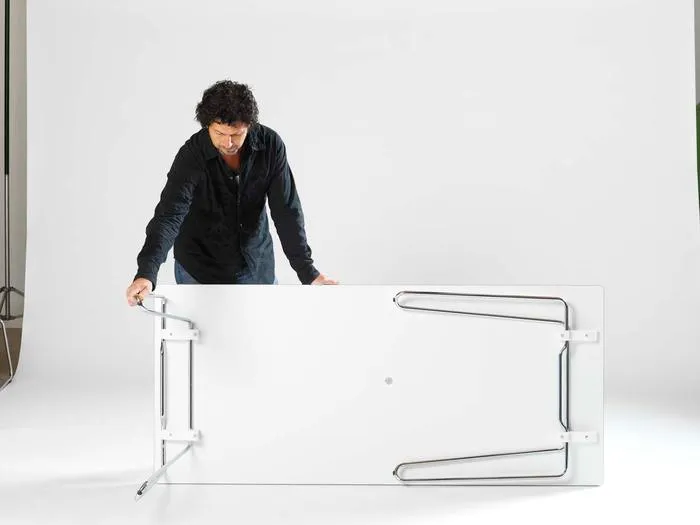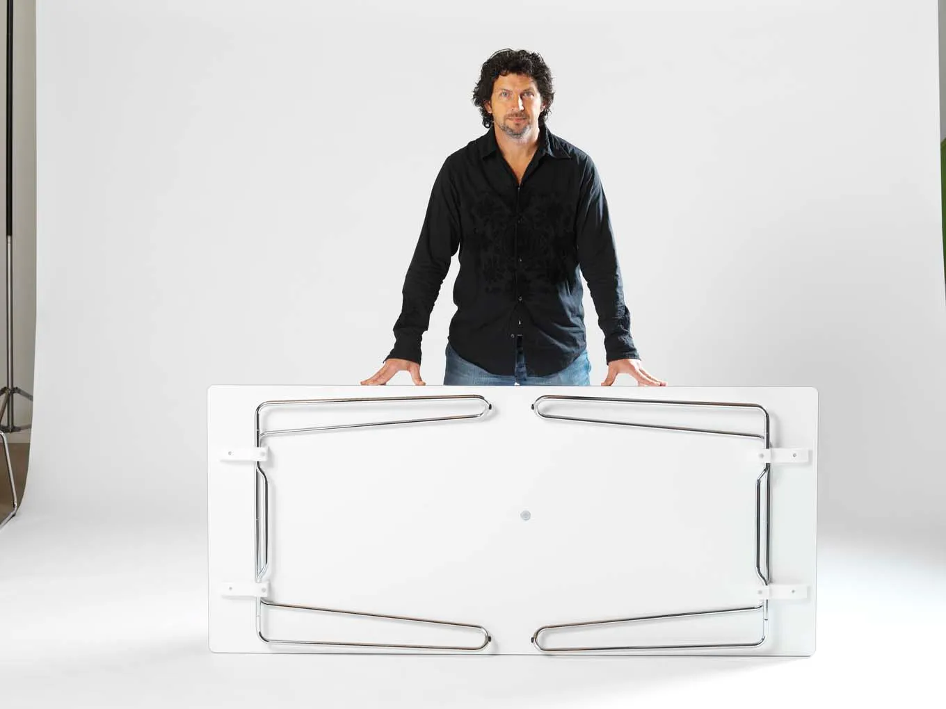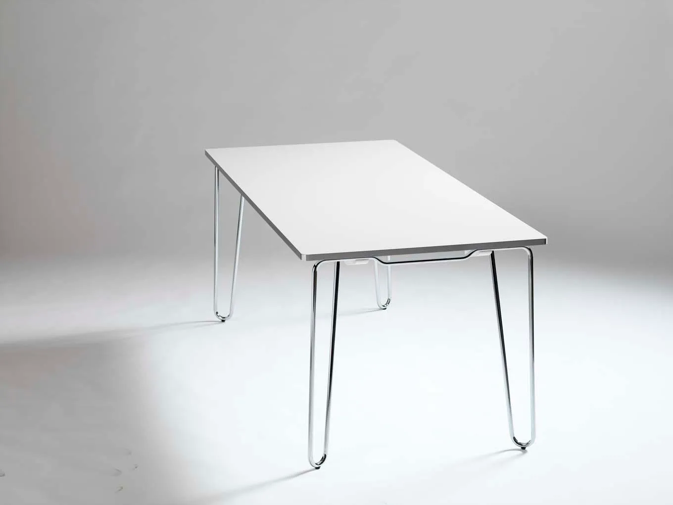 The result is a very simple and easy to handle mechanism, without anything to screw or tighten, a tension leg is fixed into a plastic holder of POM. The table has a lightweight tabletop in laminated with a edge in aluminium, the legs are in tubular chromed steel. First delivery was made autumn 2005 to the two pavilions for Ericson Racing Team in the Volvo Ocean Race. Clip was shown to the public for the first time at 100% design in Tokyo November 2005.
