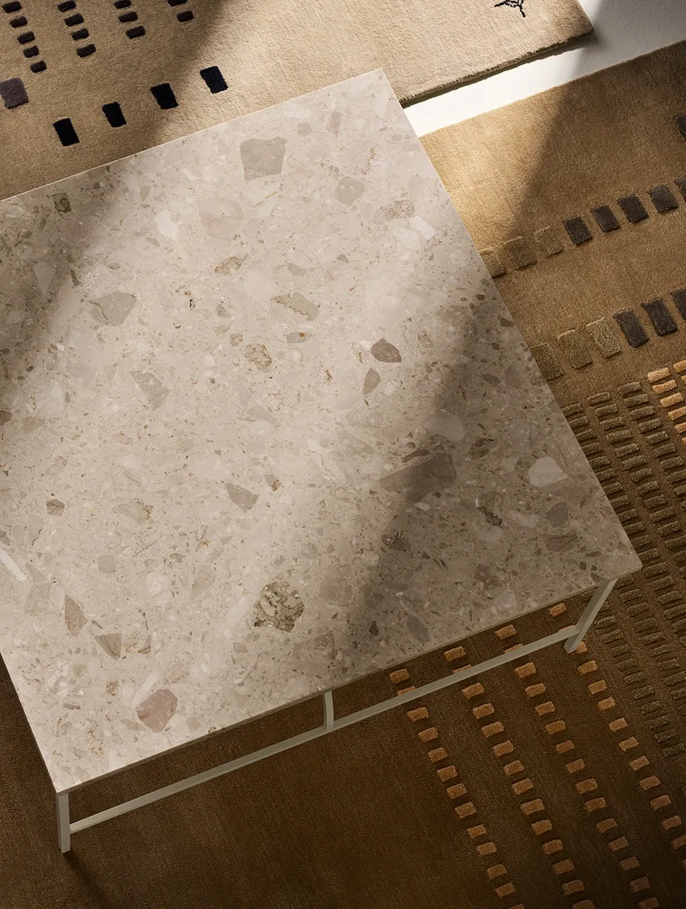 Standing alone, or as part of a group, Tabula is a rich piece with thick leather detailing and topped with beautiful terrazzo.