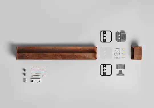 Armaturen är i Cortenstål, ett material i naturfärg som passar i de flesta utomhusmiljöer. Jan Forsmark förklarar att även i valet av material så låg inspirationen i tallskogens färgskala. ”Det slog mig att Cortenstålets färg ser precis ut som tallar i solsken,” berättar han. Konstruktören Peter Hallengren säger om Cortenstålets konstruktionsmässiga egenskaper: ”Cortenstål behöver ingen ytbehandling.