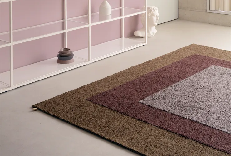 The Tegel collection includes three design variants named Corner, Side, and Centre, all defined by their distinct geometric compositions. The rugs’ layered forms are concentrated either in the Corner, on one Side, or at the Centre. Each design features three different colors that are carefully chosen to complement one another, resulting in a coherent and harmonious composition. The blocks of color form distinct areas that suggest different ways of organizing space when the rugs are placed in a room.