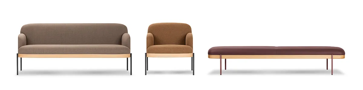 The visible wooden frame is a detail that allows numerous combinations of upholstery fabrics and finishes without compromising the design integrity. The metal support structure positioned on the outside of the wooden frame, and available in a range of finishes, presents interesting possibilities for the inclusion of integrated side tables.