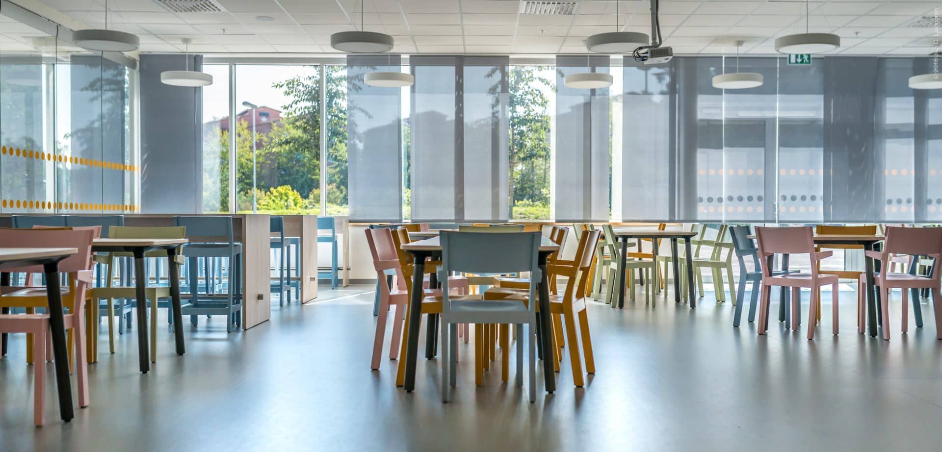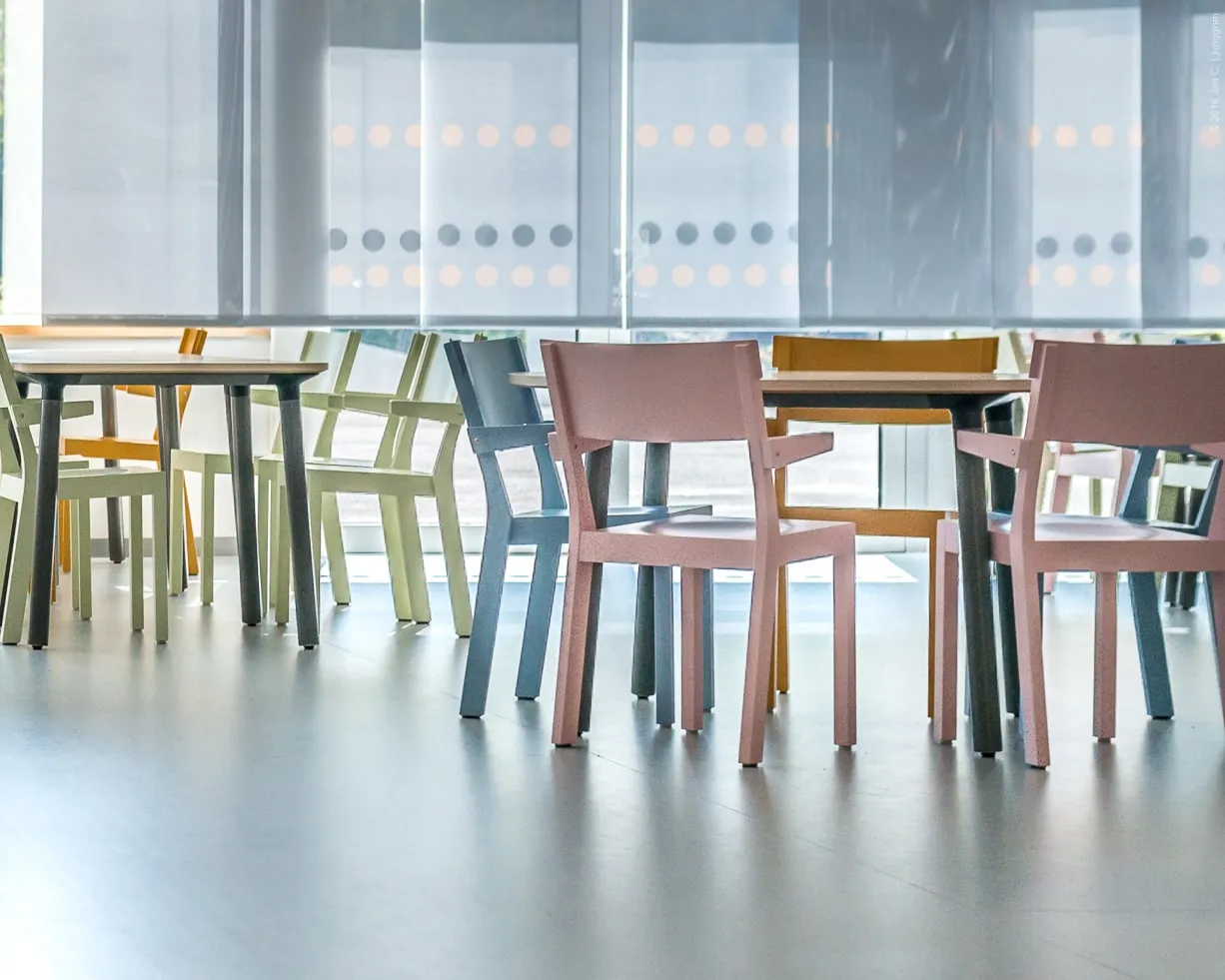Akustik is made of wood, which gives a softer feeling while also contributing to good acoustics. Since there is a lot of wear and tear in a refectory it requires furniture that can cope with being used every day. Additionally, Akustik is sound absorbing with an absorbent screen under the seat. The more chairs in the room, the better the effect and since there are many chairs in a refectory it is really practical. Akustik is also graphical in its expression and available in any colour. We also decided to give the chair, which in itself is both light and stackable, a functionality where it can be hung up which facilitates cleaning and maintenance.