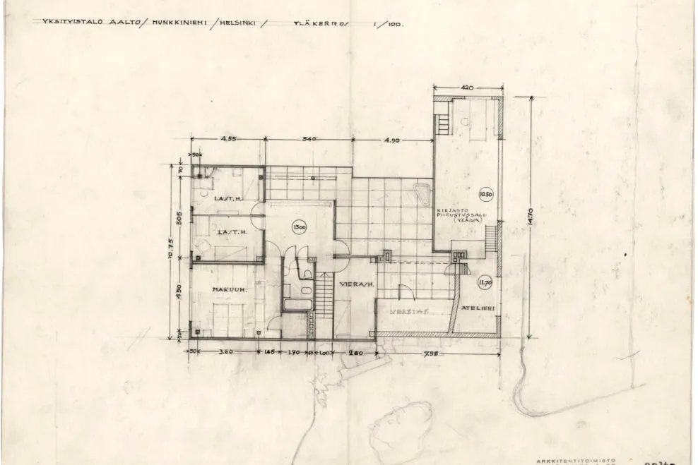 The studio, living room and dining areas, plus the kitchen and auxiliary rooms on the ground floor. Drawing © Alvar Aalto Foundation.