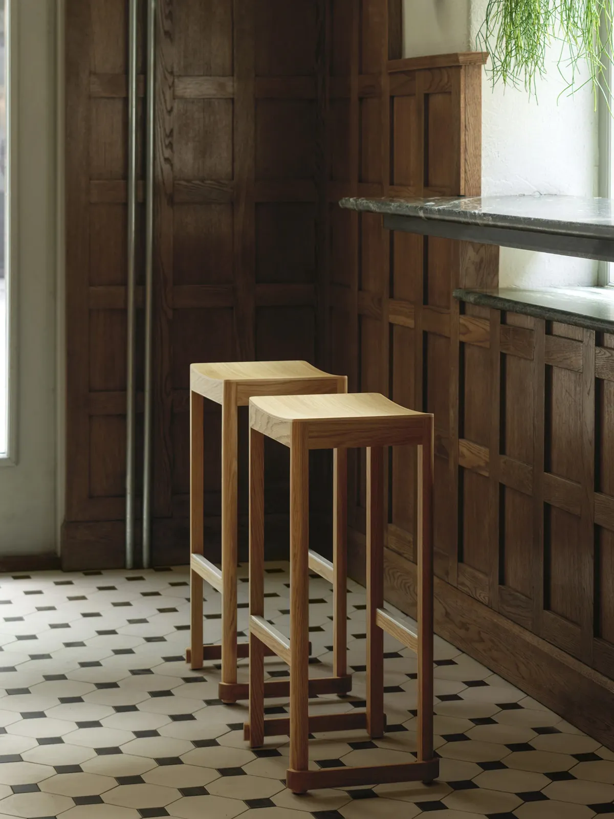 A simple seat made of solid wood, the Atelier Bar Stool is a study in precision craftsmanship. Lightweight and compact, the stool weighs about four kilograms. Its small footprint and slender proportions make it easy to move around, while its symmetrical design allows for flexible sitting at any orientation. Atelier Bar Stool consists of geometric lines gently punctuated by the curves of a seat and connecting bars that hug its wood legs. With foot rests reinforced by solid aluminium inlays, it is as sturdy as it is versatile, built to last. Manufactured in Italy from local species of wood, it is available in two seat heights, suitable for counter or bar.