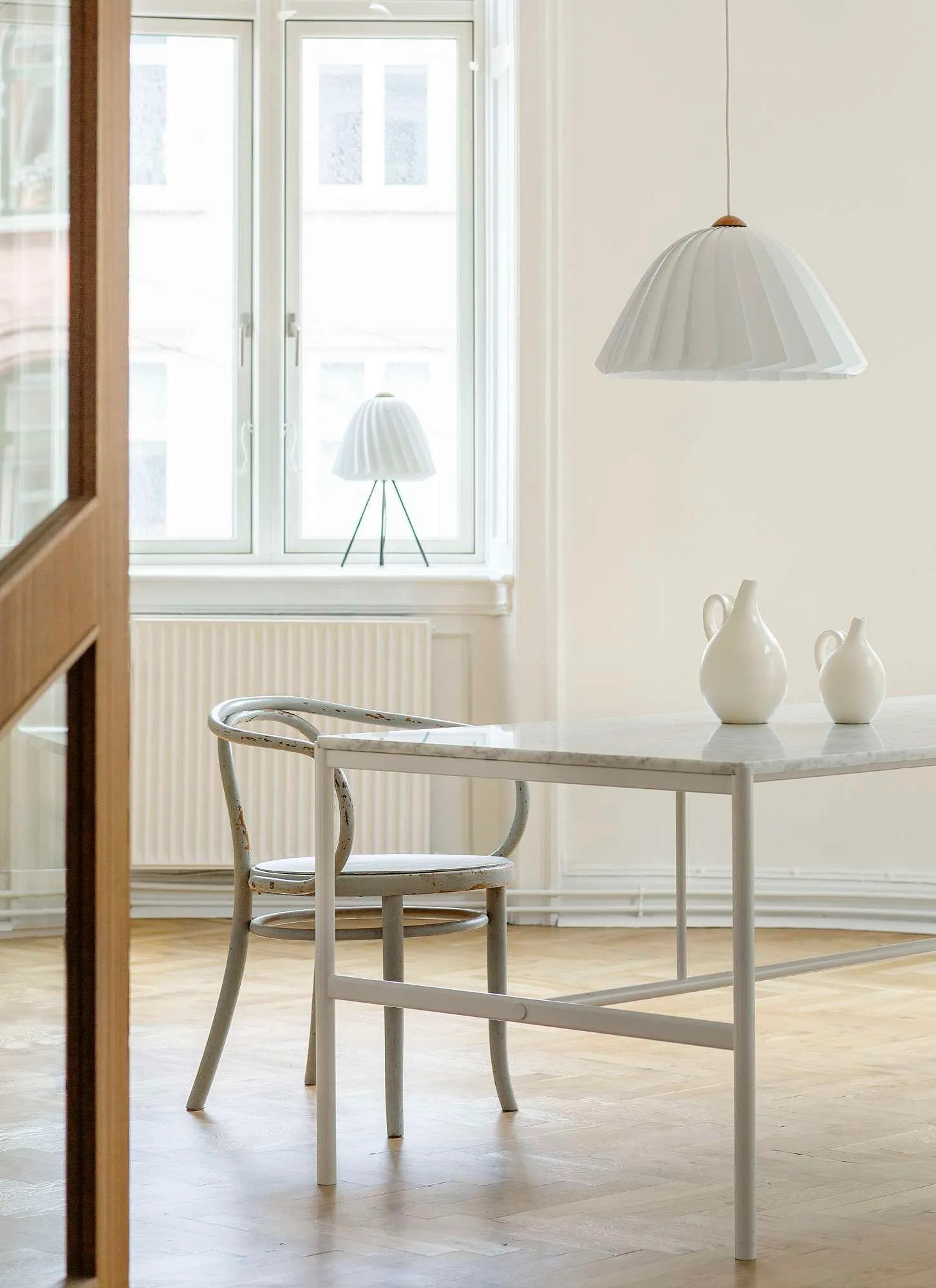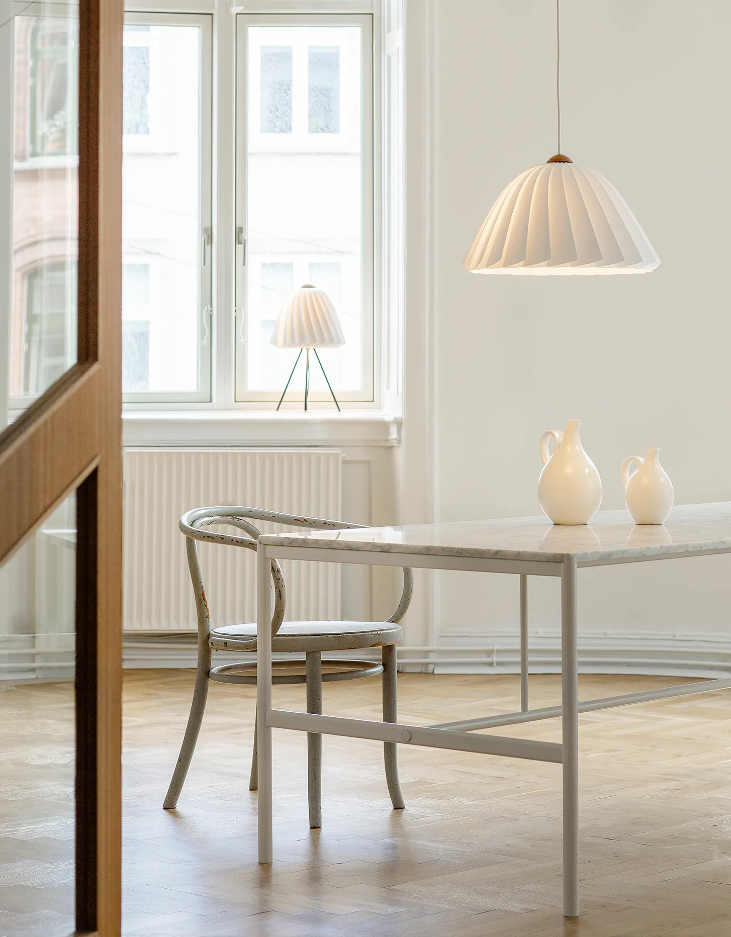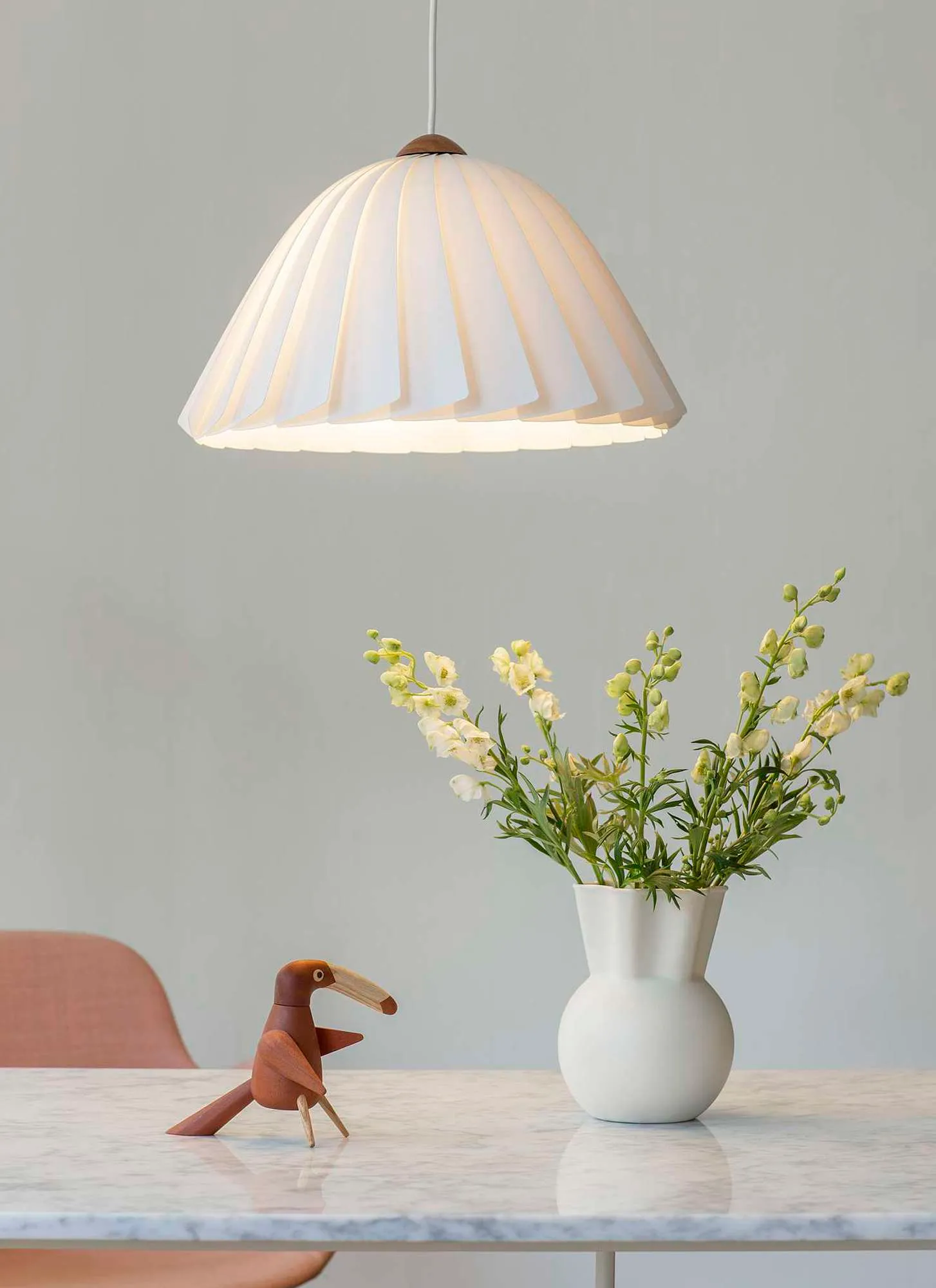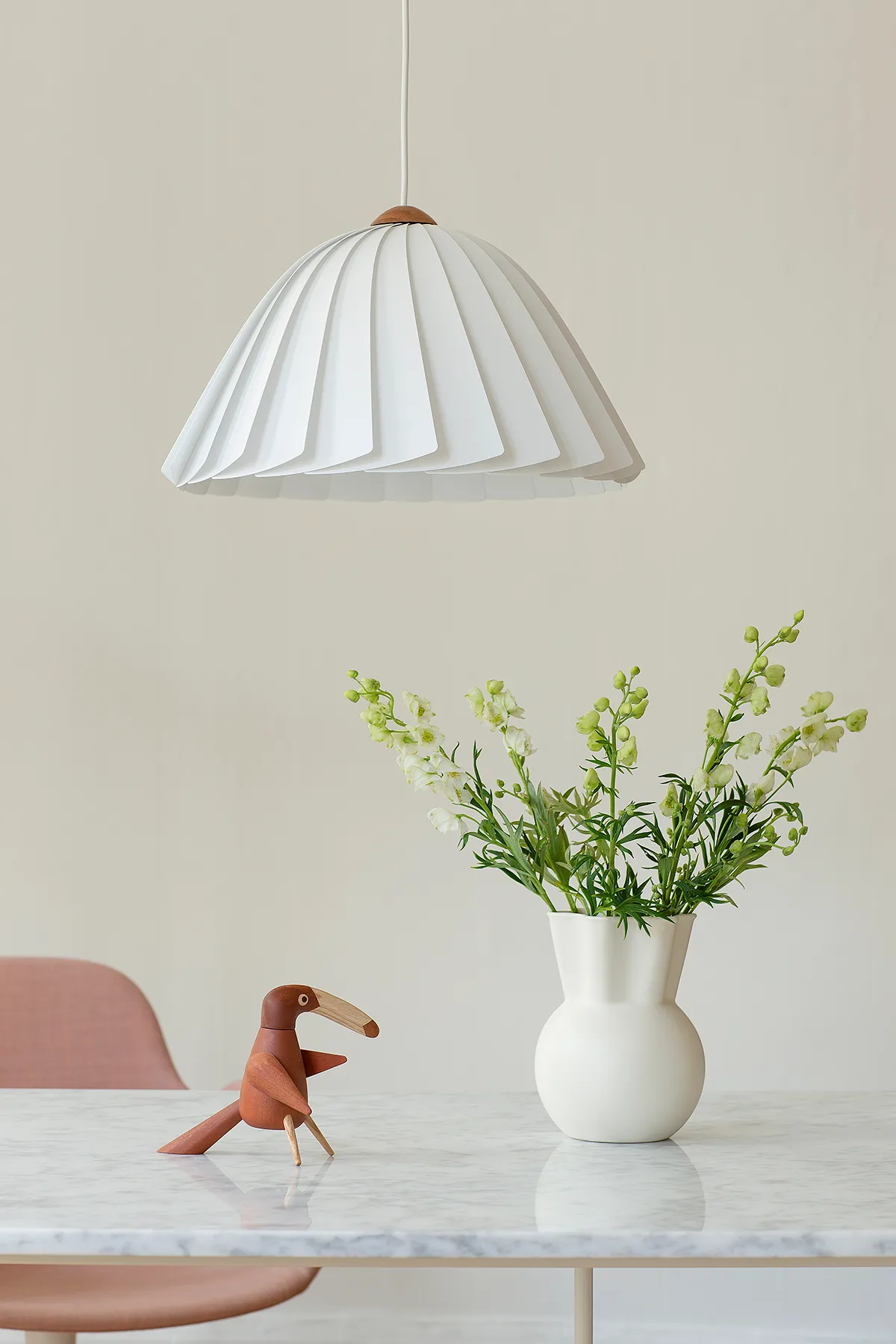 Because the Ballet shade comes as a flat rosette, you will experience for yourself how the shape is formed when you elevate the shade by the cord. At the same time, the light in the Ballet is also something very special: The light from the LED light source is sent mainly downwards, but some light also seeps out between the blades and the light fades across the outside of the lamp, the lamp gets a completely unique look.