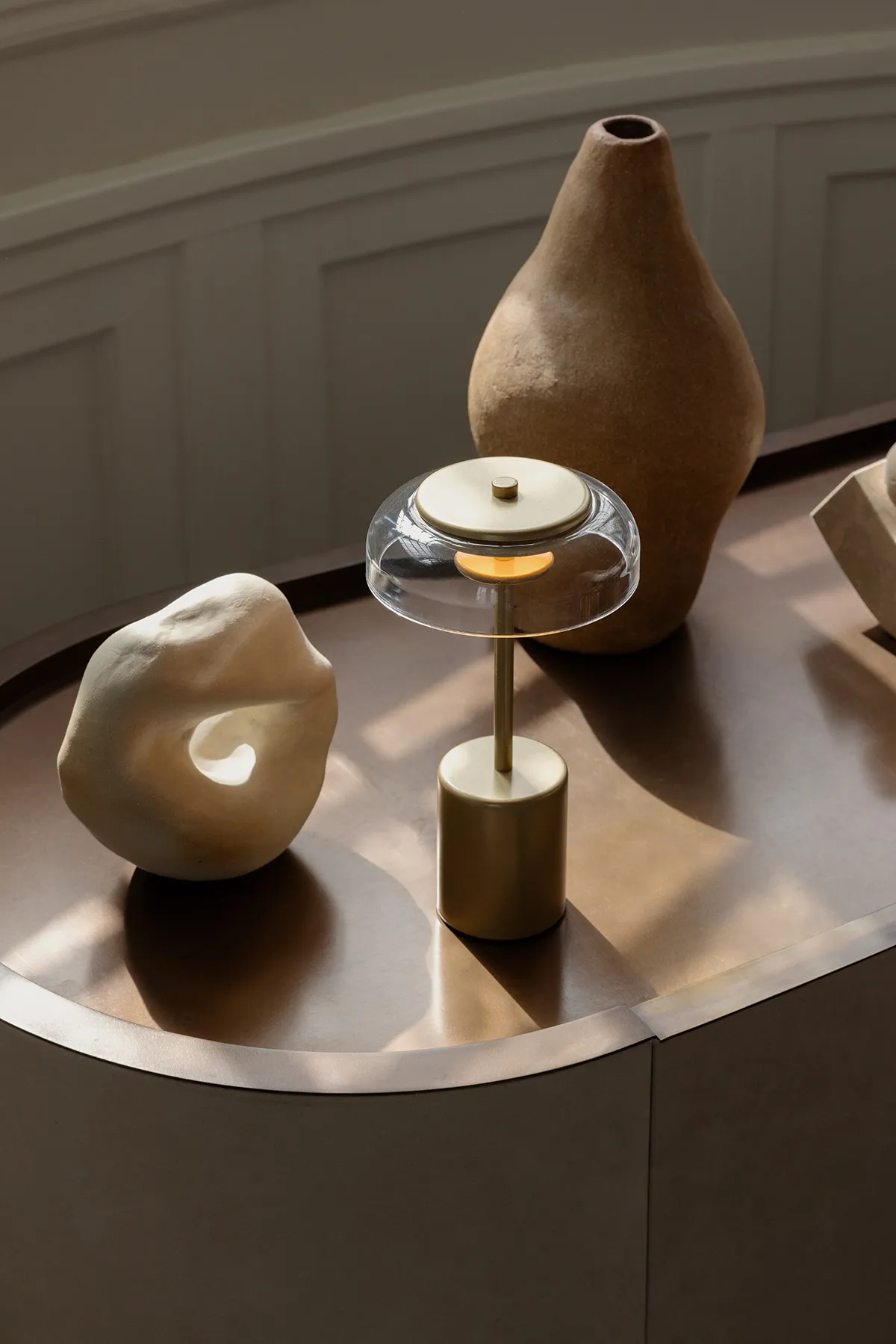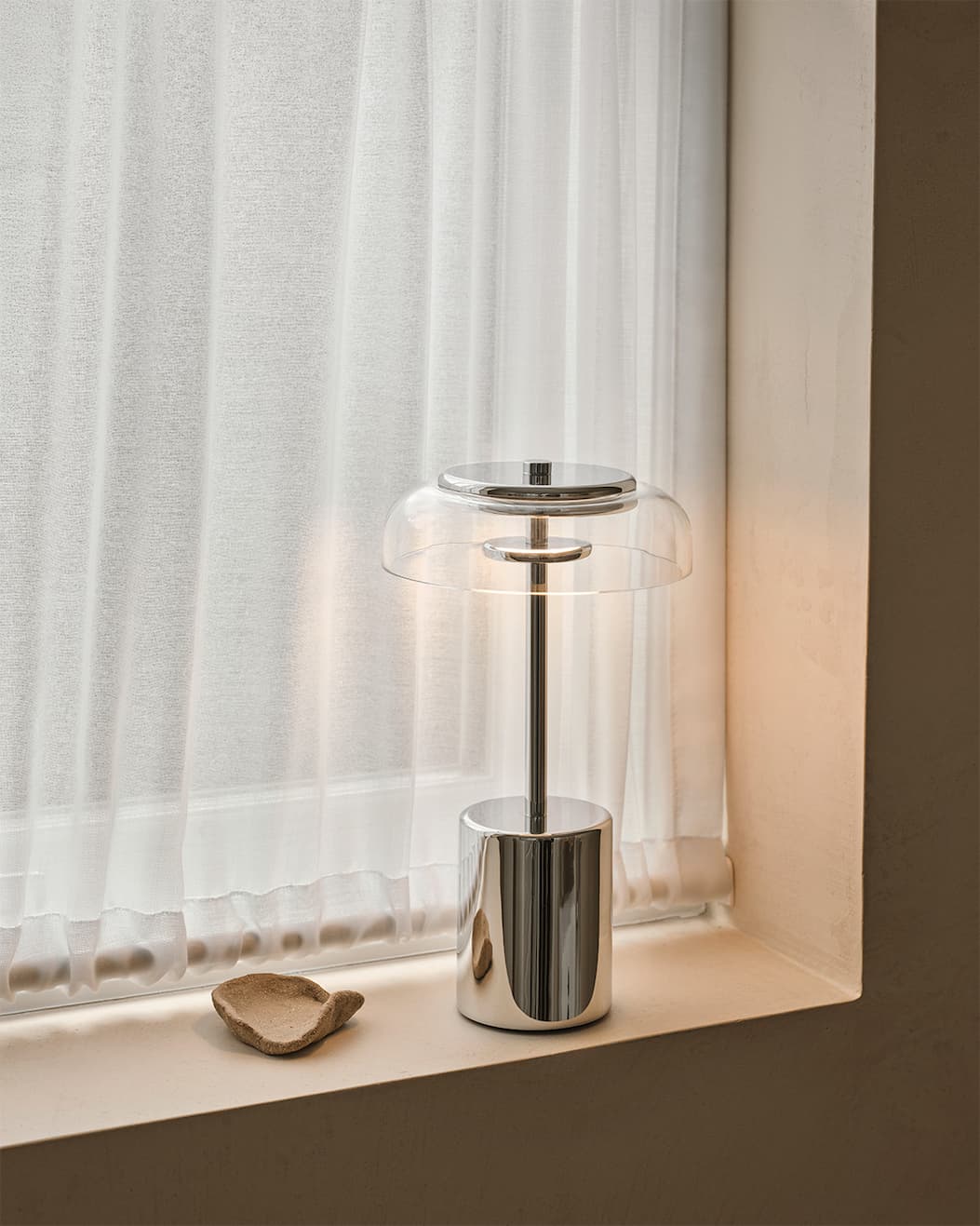 Spreading atmospheric light wherever it goes, the rechargeable, battery-powered lamp is equally at home illuminating al fresco dinners on the terrace as it lights up a dark corner of a room or an intimate dining setting. Made to withstand the elements as well as enhance interiors, it is available in black powder-coated metal with an opal acrylic shade and a distinctive golden finish with a clear acrylic shade. The new and practical acrylic shades are highly durable wherever you place the portable Blossi Table Mini.