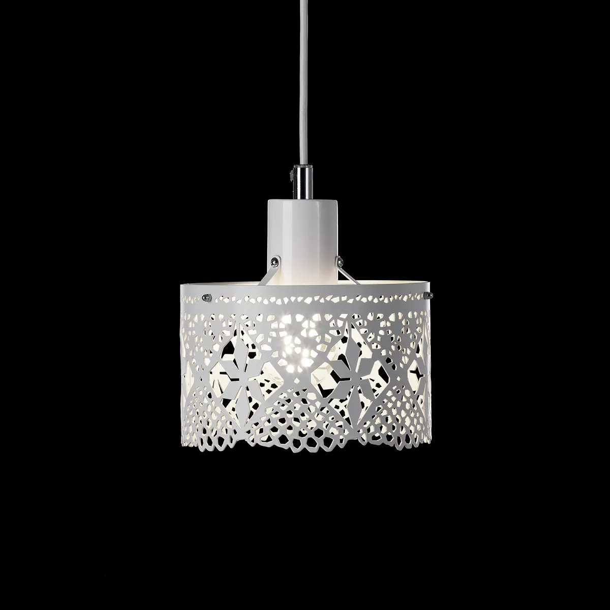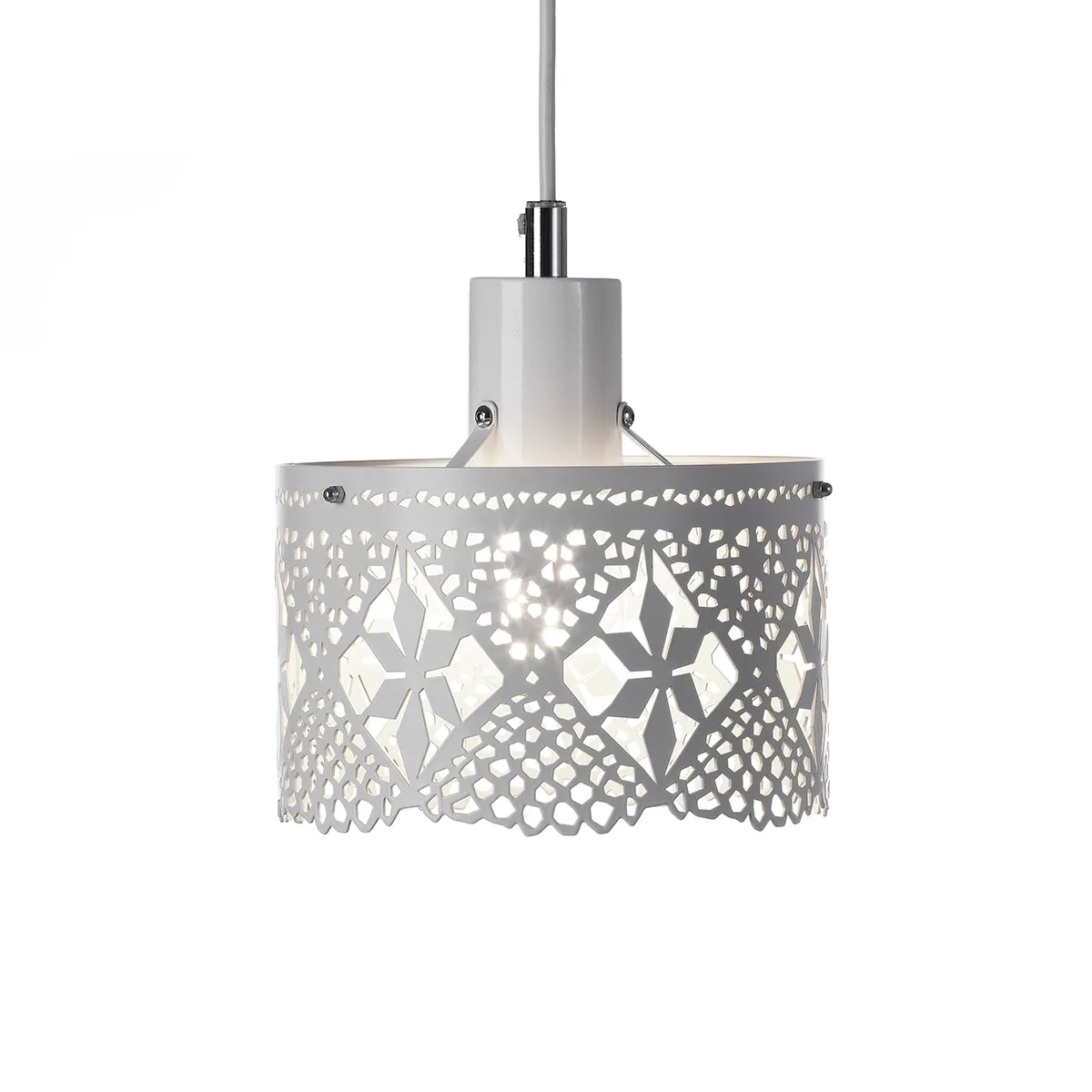 I grew up in a family where needlework, embroidery, knitting and making lace were of great importance when women spend time together. These skills are for that reason of great importance for me. The possibility to examine and work with a traditional material as laze and use this in a modern way came through a grant from the foundation of Estrid Ericson. The chandelier is a further development from the strip of lace that is laser cut out of 1mm thick metal sheet to get this light feeling. It was interesting to give a hard material the illusion of being thin and fragile. I want you to feel a festive feeling when you use these products.