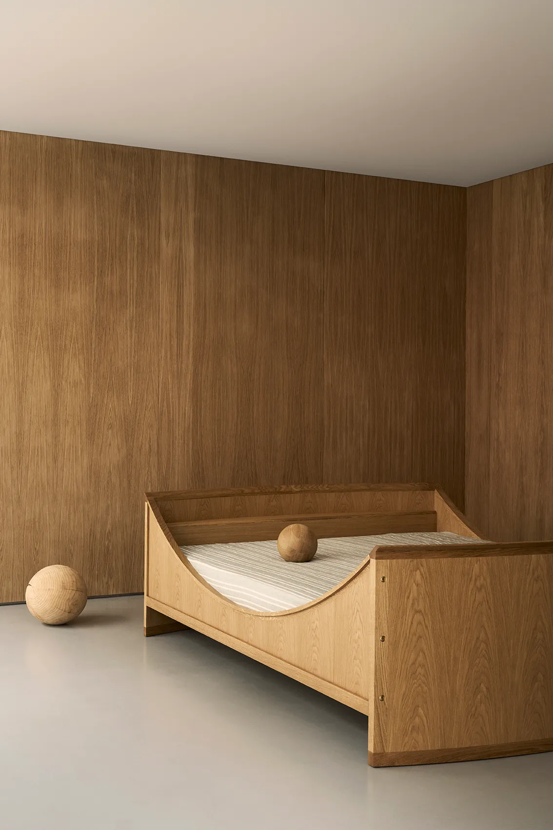 Klint designed The Spherical Bed as a single bed with a diameter of 2.3 metres. The space between the headboard, footboard and sides follows the shape of a fictitious sphere, mirroring its rounded edge. The Spherical Bed has since been hailed a mathematical stroke of genius, as all the dimensions are unbelievably precise, despite Klint not having access to 3D programs or other digital aids in the 1930s to realise this complex design.