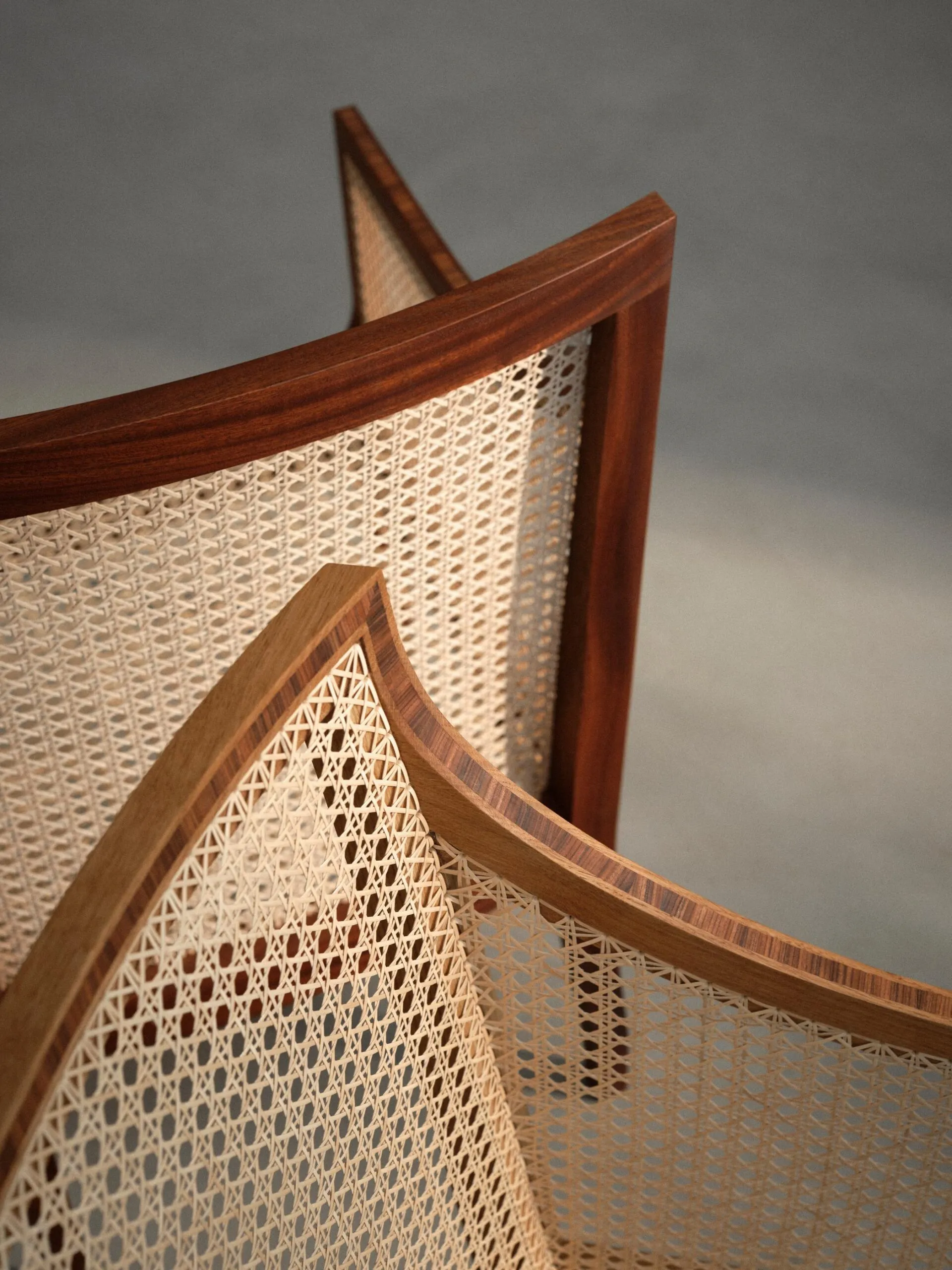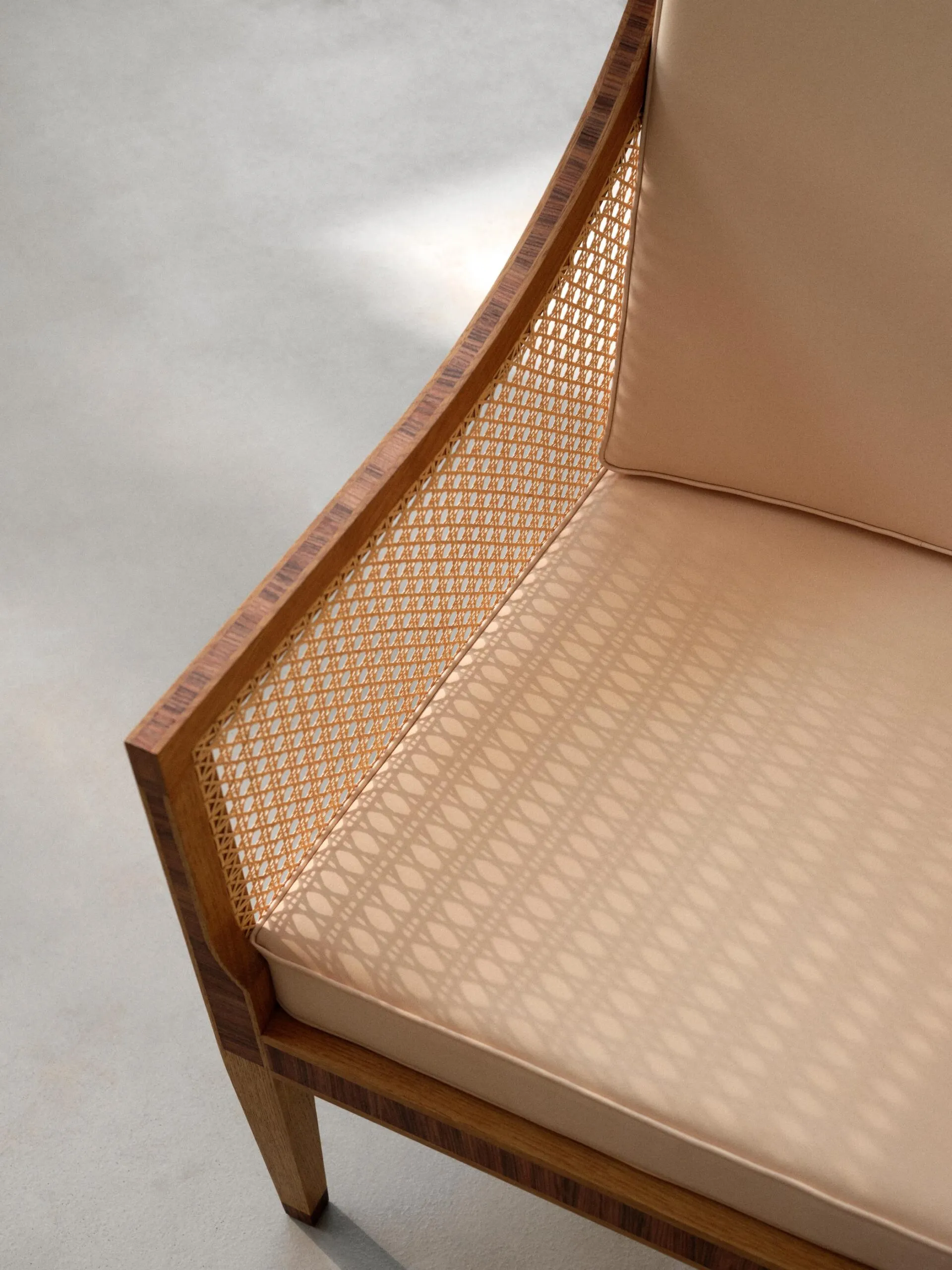 Kaare Klint presented The English Chair at the Cabinetmakers’ Autumn Exhibition in Copenhagen in 1931. He was inspired by old English chairs from the 18th century – it was typical for him to revisit existing designs in order to optimise them. In The English Chair, Klint has masterfully used wood as a decorative element by incorporating it as a contrasting material, both on the chair legs and in the form of advanced intarsia on the armrests, backrest and under the seat. The back, sides and seat are made of French canework, and it takes a skilful weaver almost a week to complete just one chair. Although the design of The English Chair is refined and pared back on first glance, the complexity of the craftsmanship is incredibly high. The loose cushions are upholstered according to customer wishes.