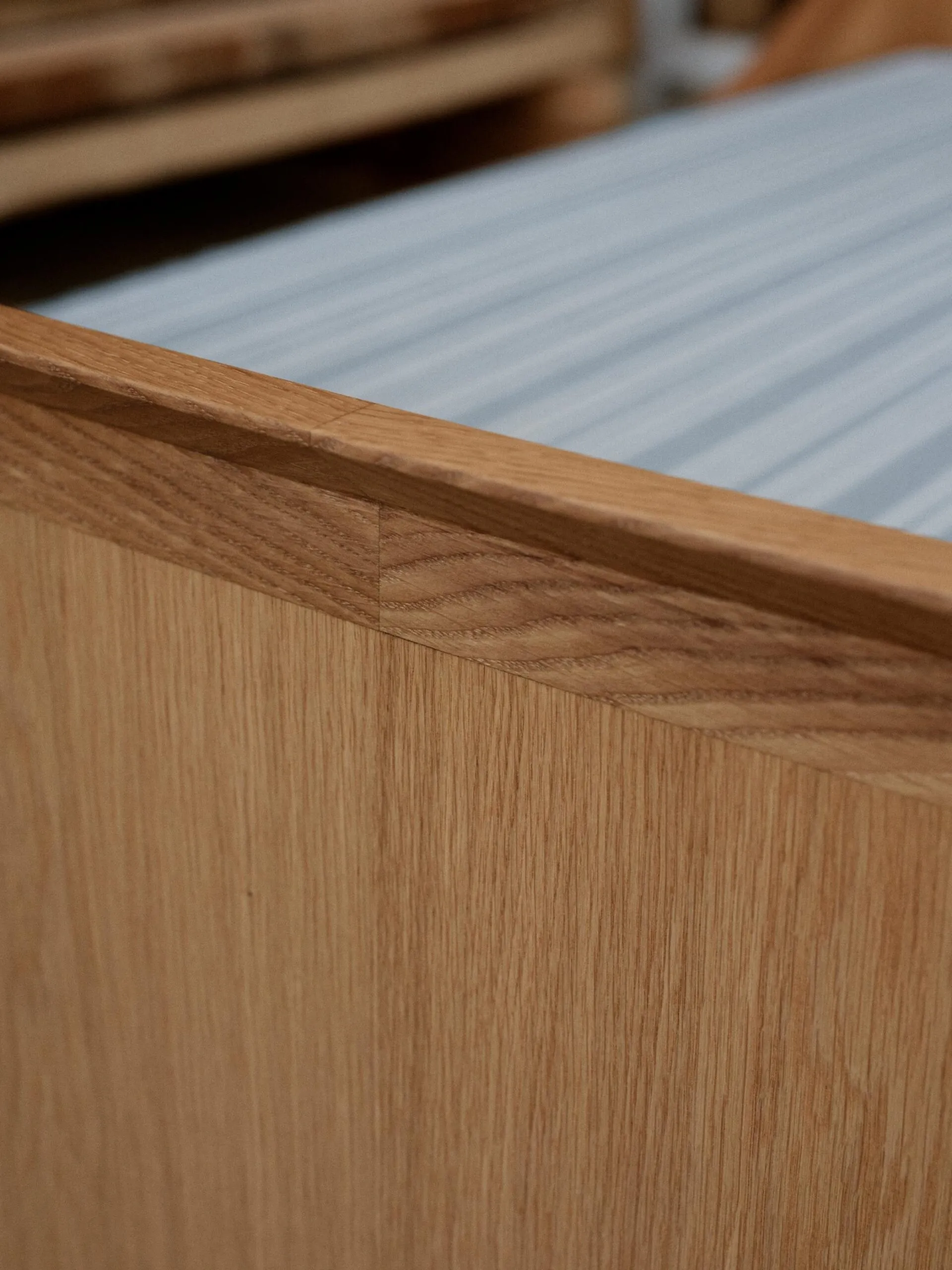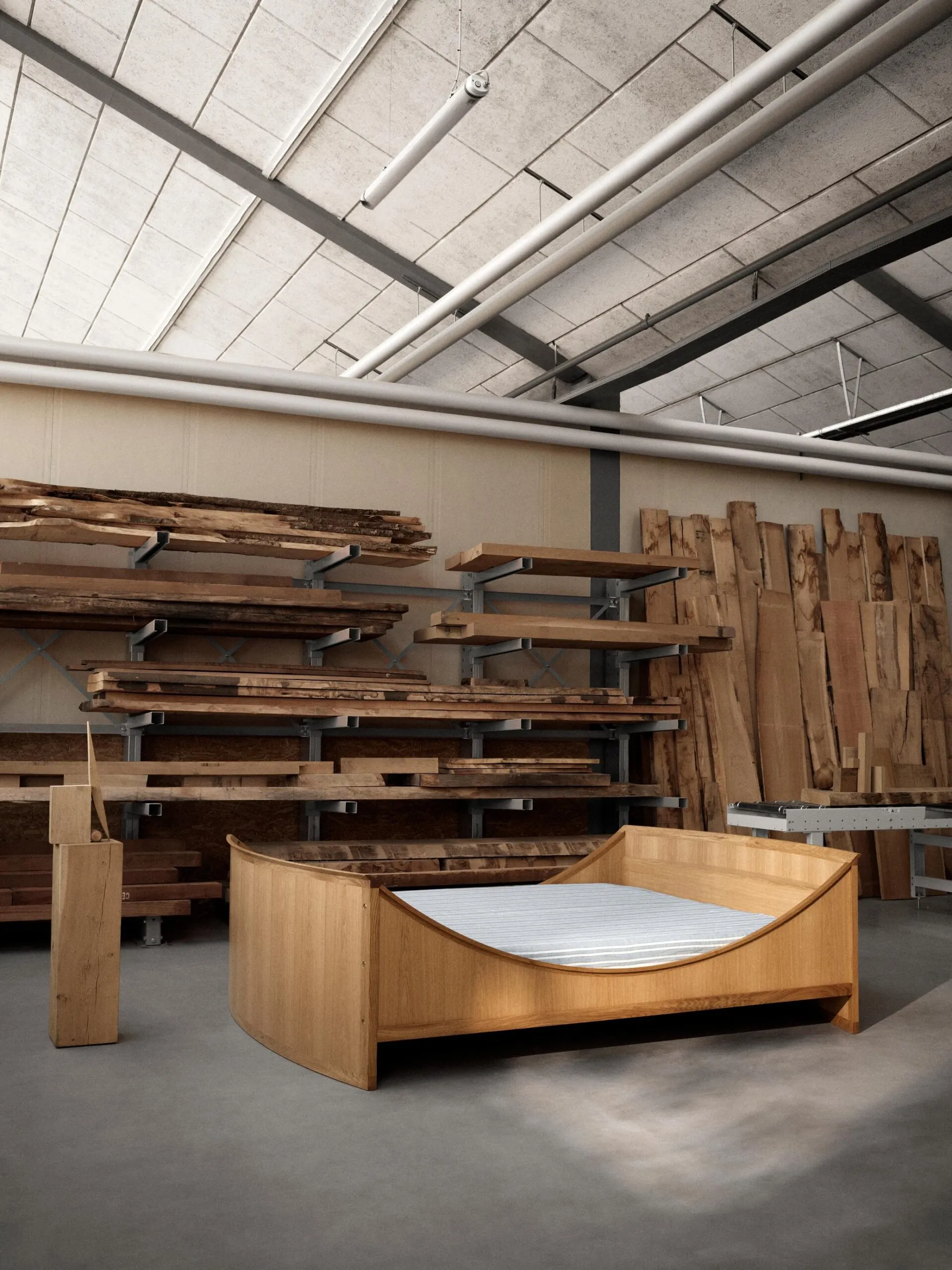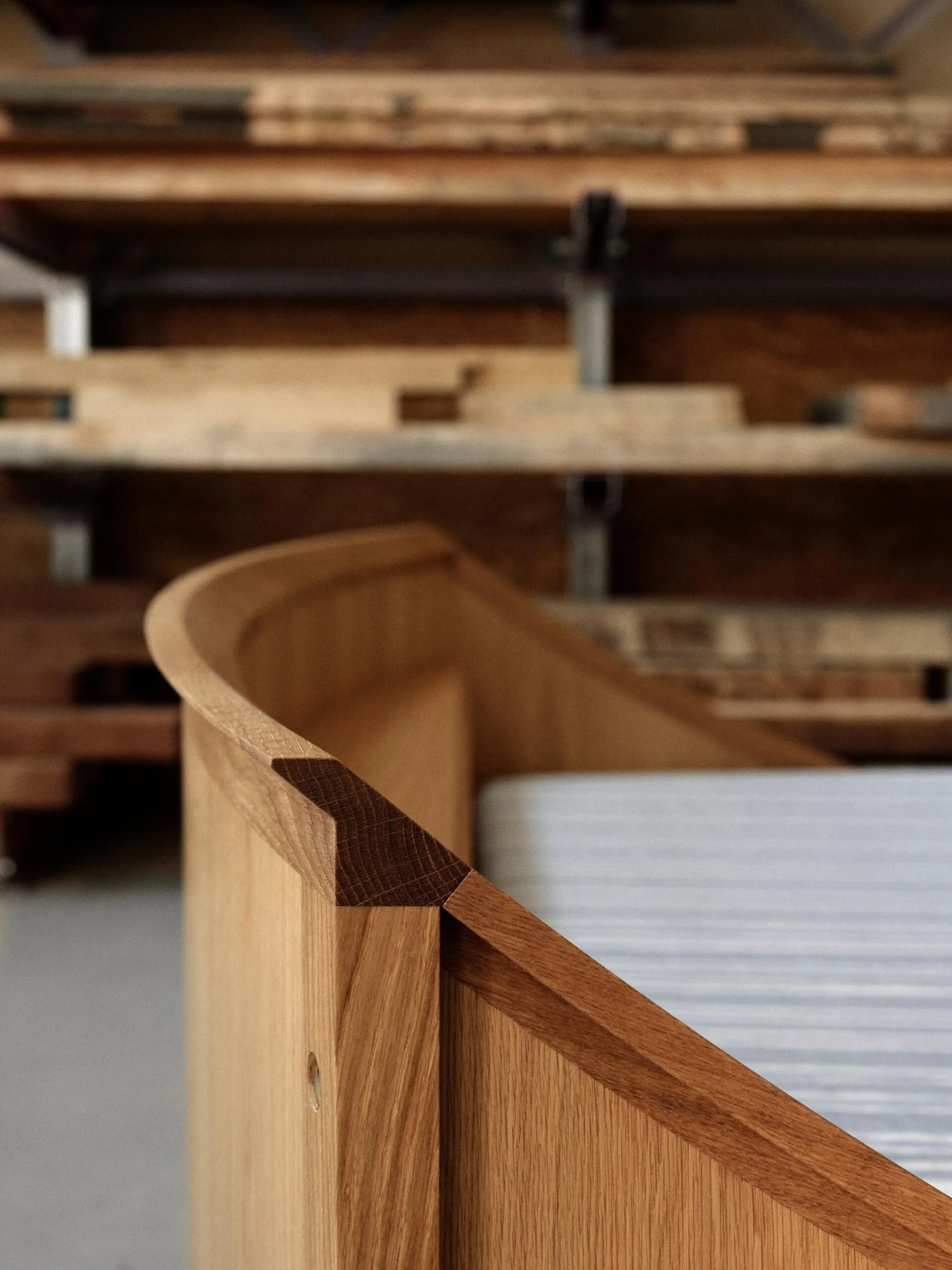 For the first time, The Spherical Bed is now being presented as a double bed, where the high head and footboards create a well-defined space in the room. As a special detail, all the wood for the frame comes from the same tree trunk to create a uniform look, highlighting the beautiful grain on all the exposed surfaces. The bed’s complex design and superior craftsmanship are time-consuming; it, therefore, takes a full month just to make one bed.