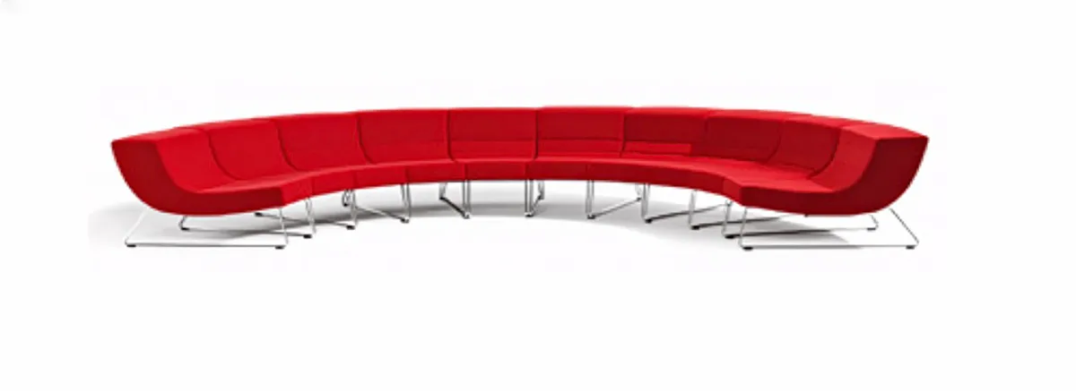 The Fatback easy chair and sofa system has a new add on section, a whole circle of these sections consists of 20 pieces, so to make a 90 degree corner you need 5pieces. The add on section is possible to link together with the straight section. When Fatback is used as easy chairs we recommend to use the straight section and the round section only as an add on section. A big circle will have an outer diameter of 4,5 metres and an inner diameter of 2,5 meter.