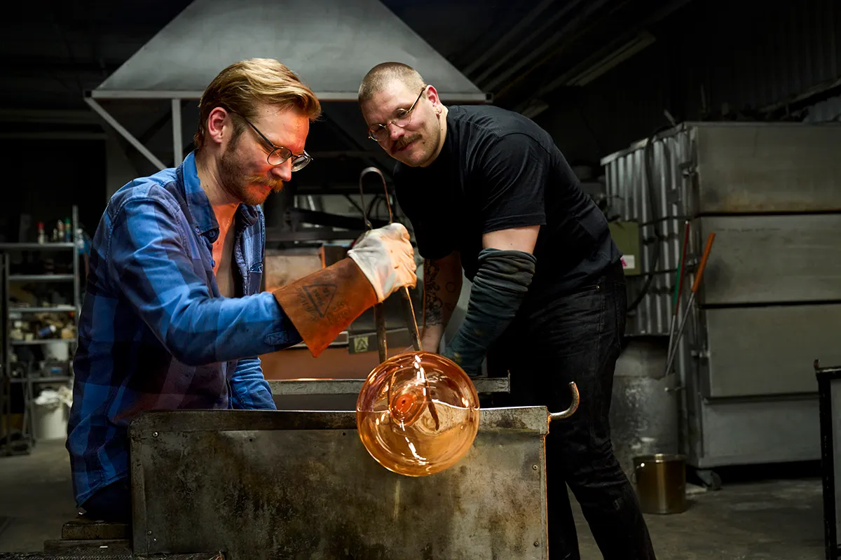 Akira Minagawa työskentelee yhdessä lasinpuhaltaja Kaappo Lähdesmäen kanssa Nuutajärvellä. Akiran teokset tulevat osaksi Finnish Glass Biennalen ohjelmaa. Kuva/Photo: Ella Tommila / SLM