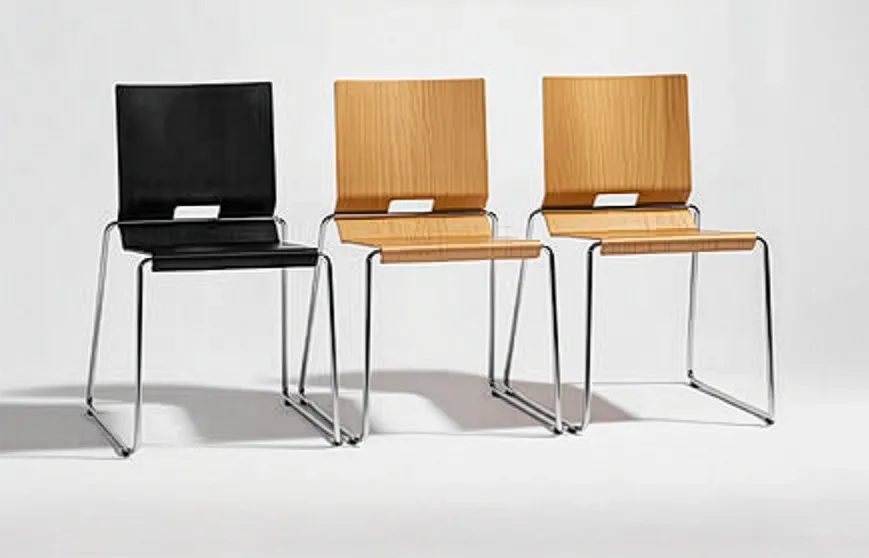 Chair with moulded seat rim and legs in chrome-plated steel. Comfortable, light, stackable and linkable. The seat rim’s surface is available in birch, walnut, oak or painted white, black or red.