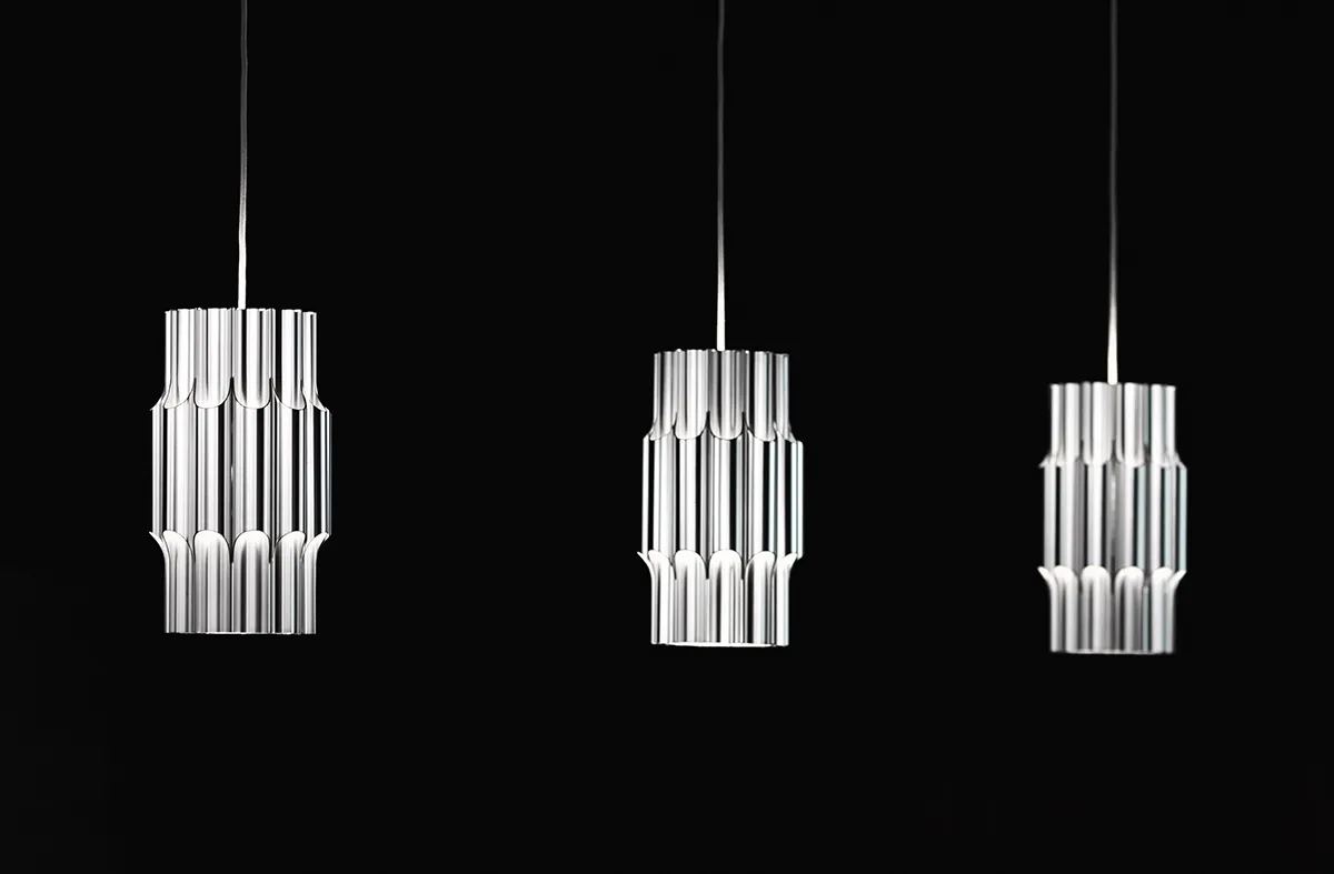 The iconic pendant is designed by Bent Karlby in 1970 and crafted from 12 polished aluminium pipes. While elegantly illuminating its glossy exteriors through its open pipes, the pendant provides comfortable downlight and subtle ambient lighting through its open top.
