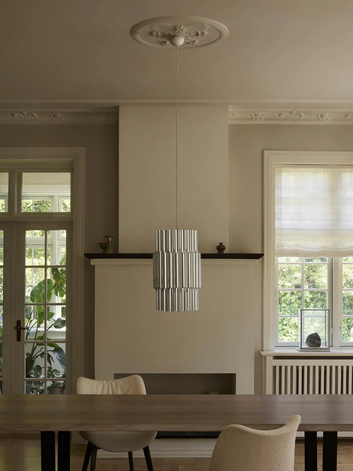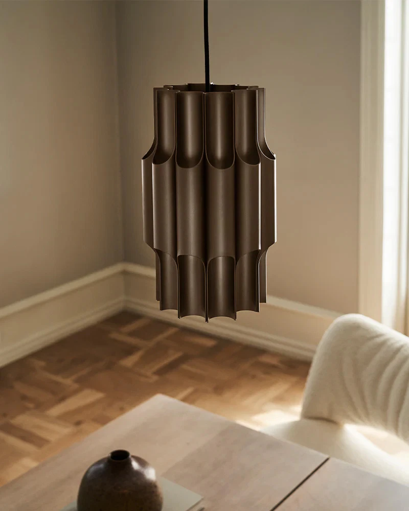 The iconic pendant is designed by Bent Karlby in 1970 and crafted from 12 polished aluminium pipes. While elegantly illuminating its glossy exteriors through its open pipes, the pendant provides comfortable downlight and subtle ambient lighting through its open top.