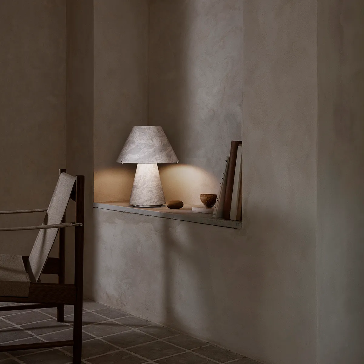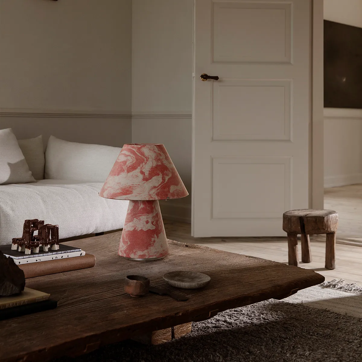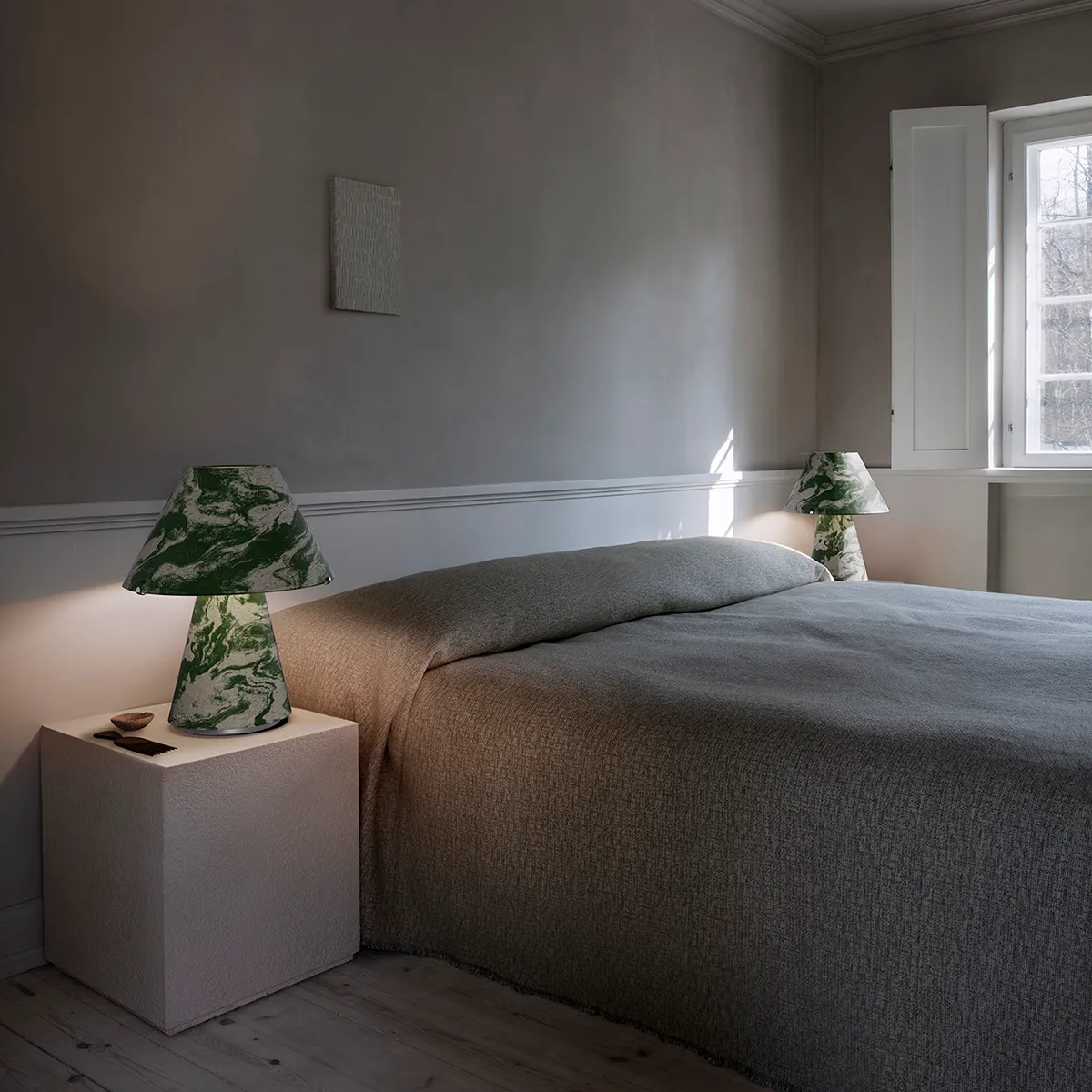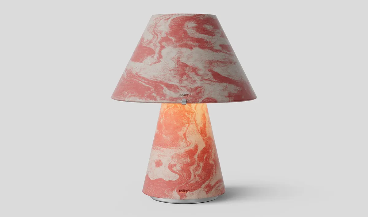 For the initial launch of Upglas, the focus is on table lamps in two different shapes, available in four colour versions. Each one is duo-toned to accentuate the uniqueness of the material and its unpredictable patterns. Carefully selected by Astep with Luca Nichetto, the four colourways will include a black on white variant, a white on light grey, a green on light grey, and a warmer tonality in red on light grey.