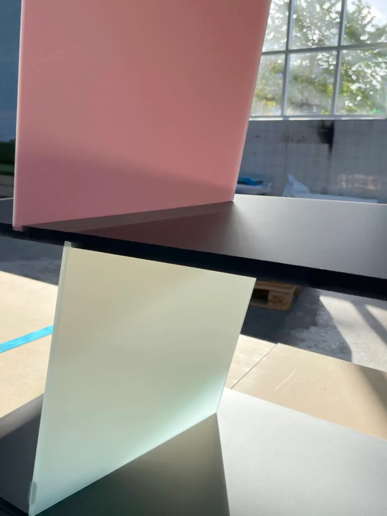 The Oblique shelving is Boris Berlin Design’s contribution to this year’s edition of the Cabinetmakers Autumn Exhibition. It is factory-produced exclusively from 100% Green Cast recycled acrylic plates, with no waste or use of any other materials. The production takes place in a single industrial process using 5-axis CNC milling, ensuring both efficiency and sustainability.
