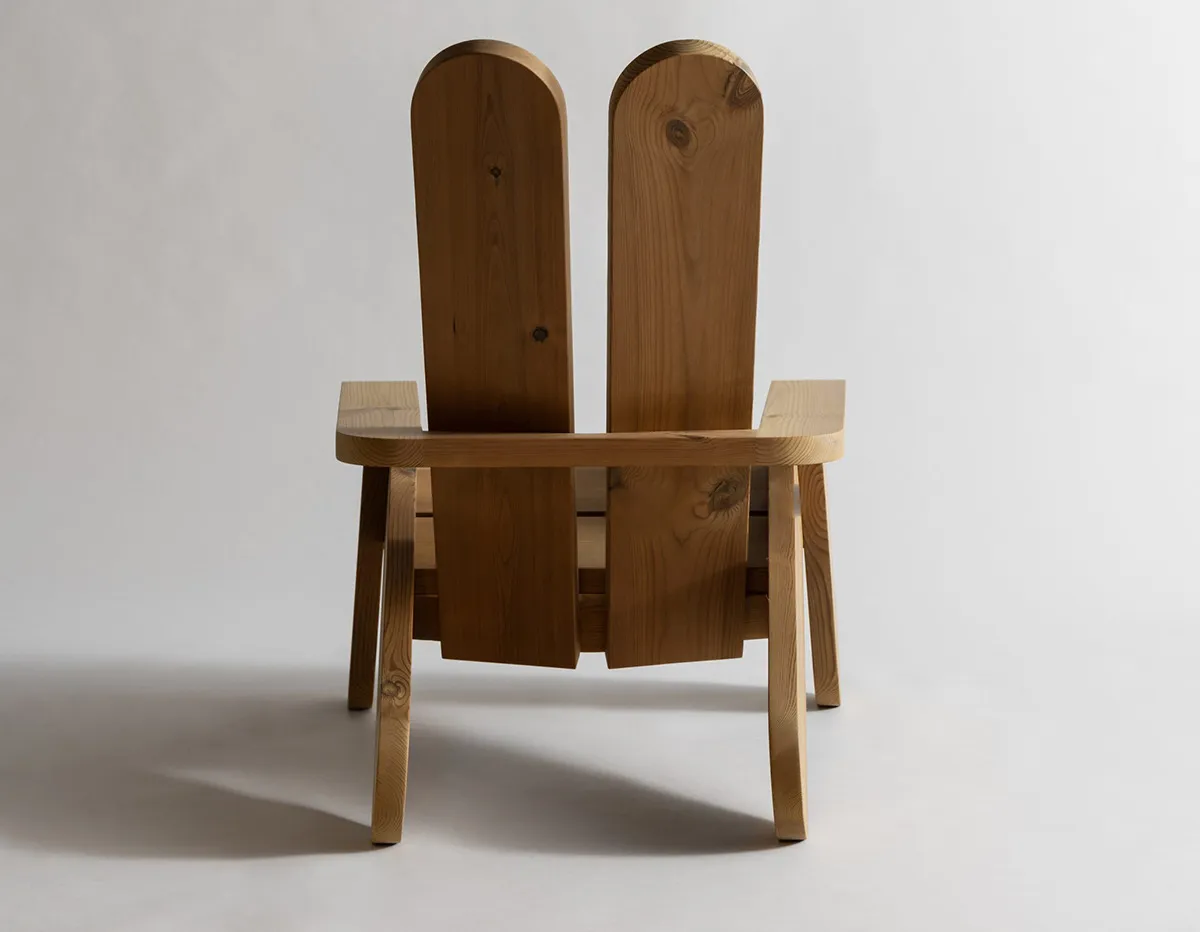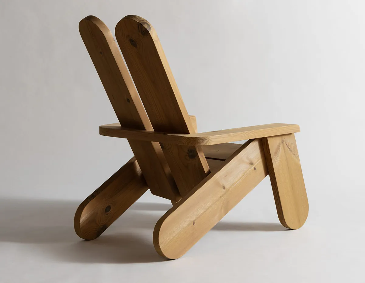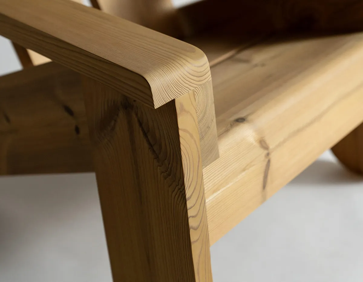 With extreme proportions and explicit ergonomics, this uncompromising outdoor chair by Faye Toogood is pine furniture at its most constructive.